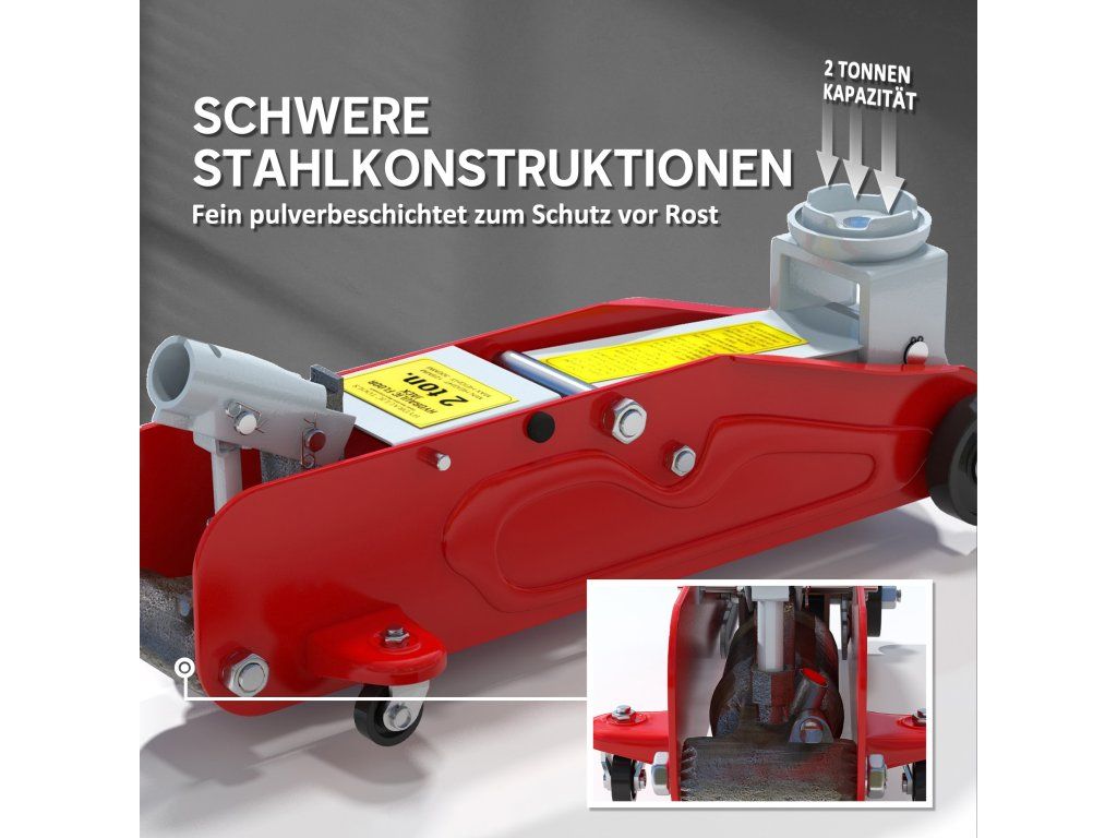 Odolné ocelové pouzdro a bezpečnost: Tento vozíkový zvedák je vyroben z vysoce kvalitní oceli s ochranným práškovým lakem a nabízí každodenní spolehlivost. Pojistný ventil spolehlivě chrání před přetížením.