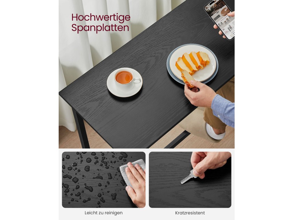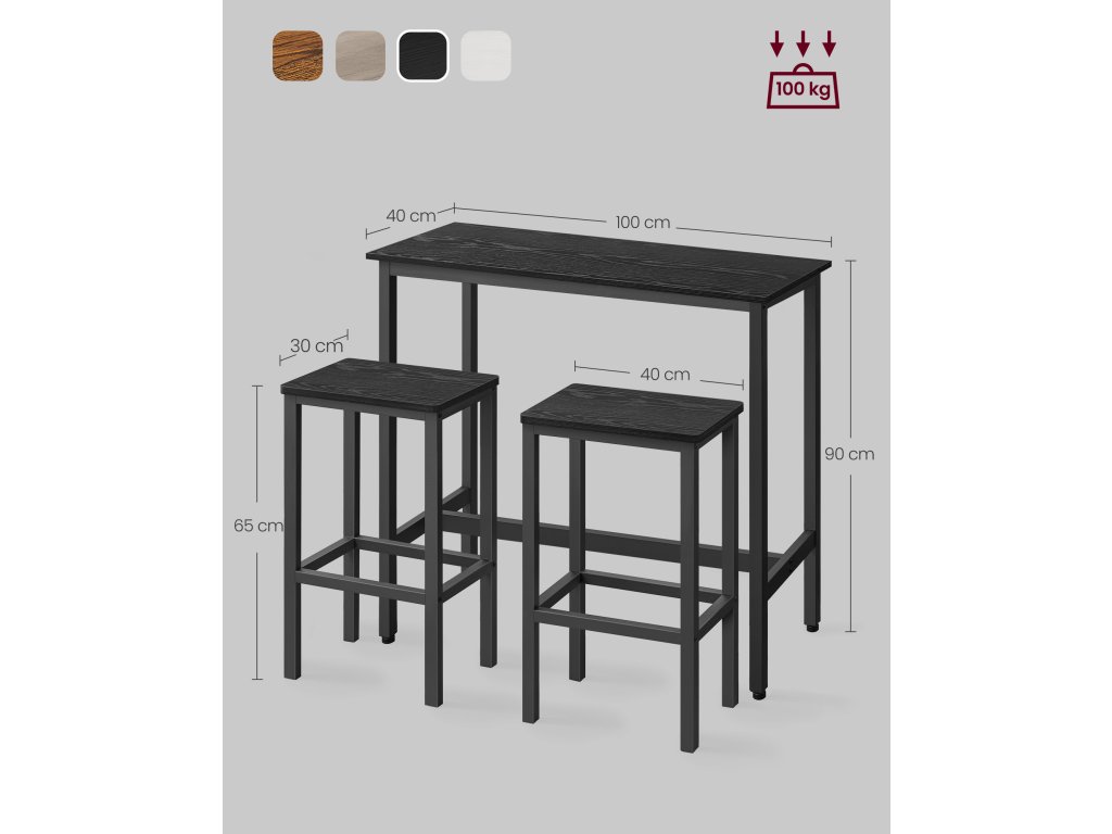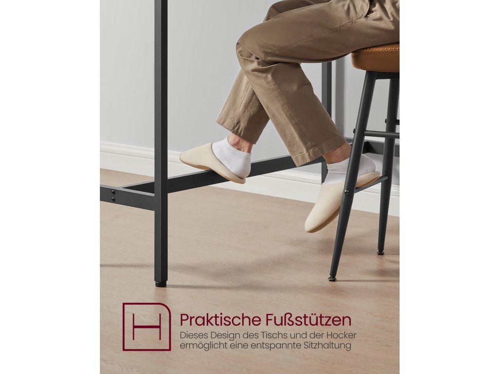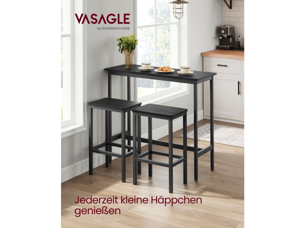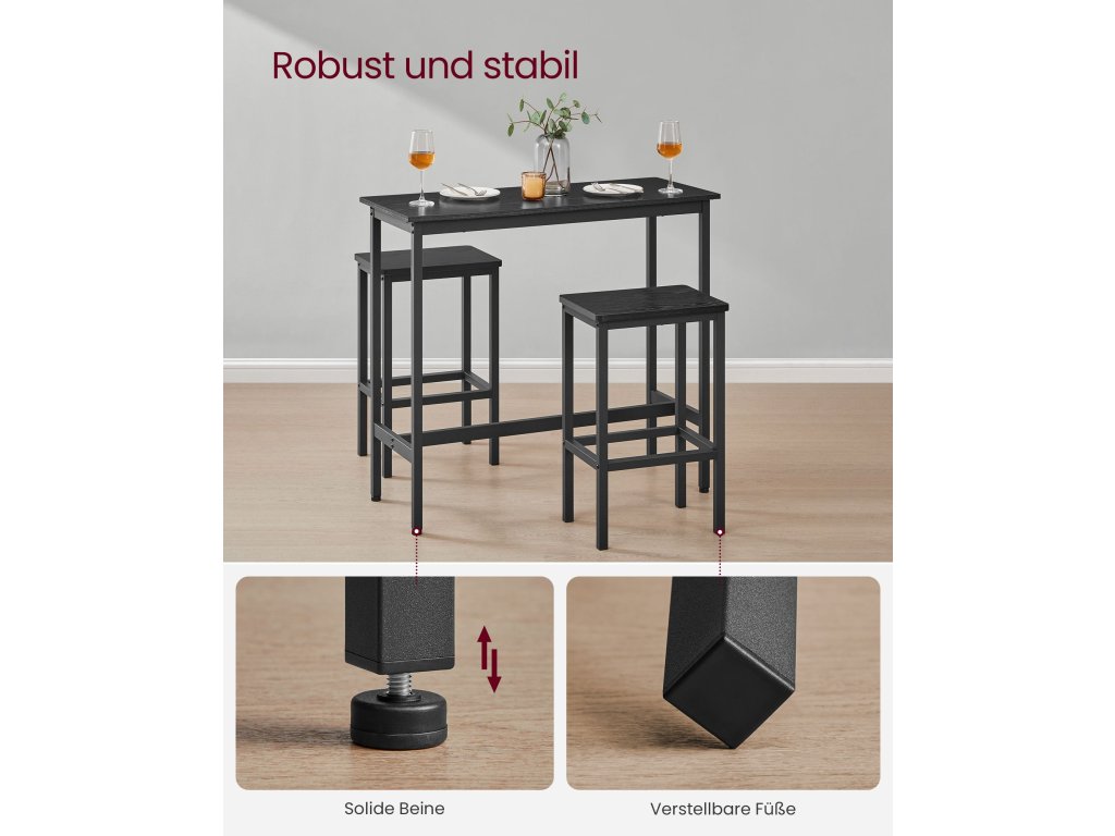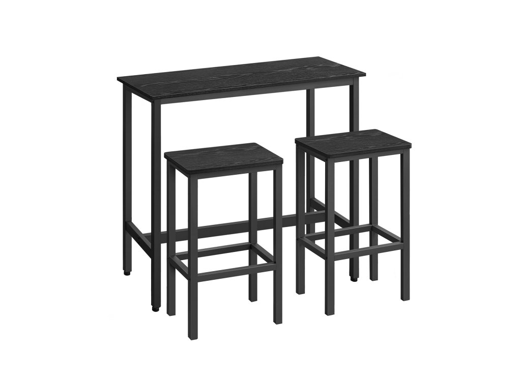 Na zdraví, milovníci barů Ať už si rádi dáte drink s přáteli nebo lehké jídlo, než se vydáte na cestu, tato sada barového stolu a stoliček vás jistě potěší. Díky ebenově černým a inkoustově černým tónům dotváří atmosféru hospody ve volném čase i v rušných chvílích.Vytvořte si snídaňový koutek Vysoký barový stolek o rozměrech 100 x 40 cm je prostorný pro uložení kávy, croissantu a džusu; dvě stoličky o rozměrech 40 x 30 cm umožňují pohodlnou snídani pro 2 osoby - stačí jeden roh;Stabilní univerzální stůl Díky nosítkům pod stolem, sadě proti překlopení a 4 nastavitelným nohám je stůl bezpečnější a stabilnější; lze jej použít v kuchyni, obývacím pokoji nebo ložnici na snídani, víno nebo práci;Čas na Mojito Obáváte se montáže? Není třeba! Tento jídelní set má jednoduchou konstrukci. Díky podrobnému návodu a očíslovaným dílům ji úspěšně sestavíte, než dopijete mojito.Co je v krabici Sada 1 barového stolu a 2 stoliček, návod k použití s taškou na příslušenství, sada proti překlopení a dobrý způsob, jak si dopřát dokonalou relaxaci u vás doma.| Kategorie: | Barové sety |
