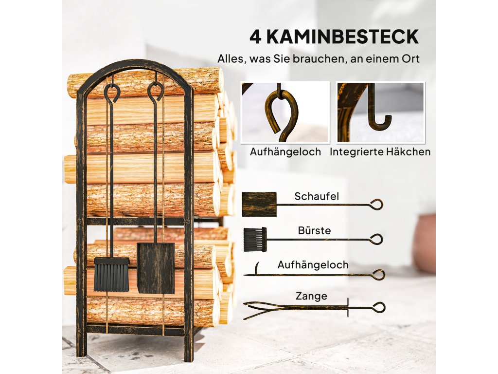✔ Součástí balení jsou čtyři kusy krbového nářadí s bočními háky pro organizované a snadno přístupné skladování.