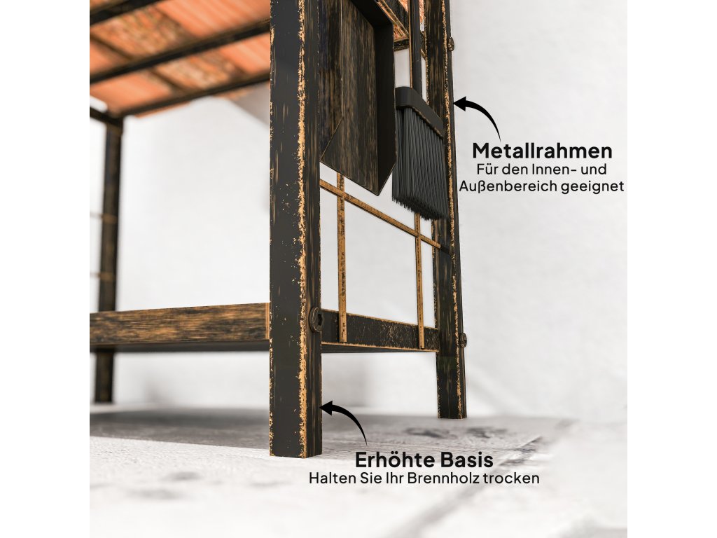 ✔ Zvýšená základna stojanu na palivové dříví podporuje cirkulaci vzduchu a udržuje palivové dříví suché.