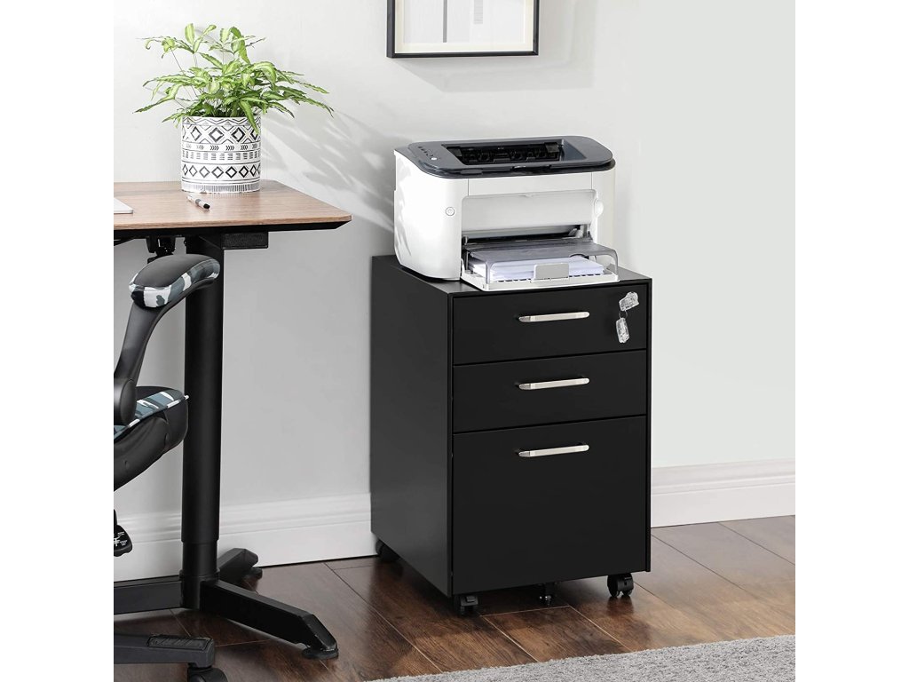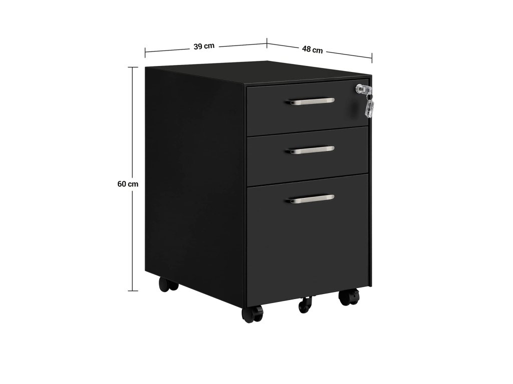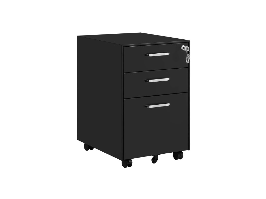 Kancelářská komoda, uzamykatelná kartotéka, 3 zásuvky, kolečka, na dokumenty, psací potřeby a závěsné složky, do kanceláře a pracovny, ocel, černá.