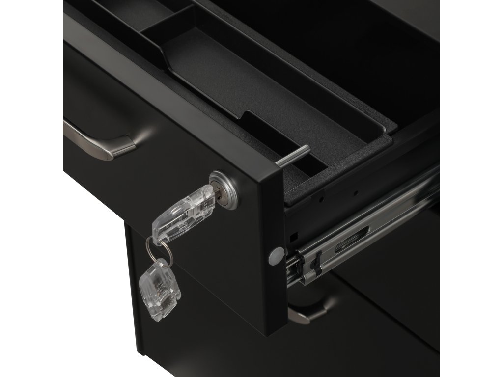Stabilita pro kancelářského hřebce: Jste opravdový pracovní kůň se spoustou dokumentů? Každá zásuvka tohoto ocelového vozíku unese až 15 kg, což je pro vaše spisy dostatečné. Přídavný váleček pod spodní zásuvkou pro zavěšení pořadačů zajišťuje vysokou stabilitu.ÚPLNĚ OTEVŘENÉ NEBO ZAVŘENÉ - Robustní pojezdy umožňují úplné vytažení zásuvek a zároveň poskytují stabilní úchop. Díky vysoce kvalitnímu zámku můžete uzamknout 2 zásuvky najednou a chránit tak své soukromé soubory.