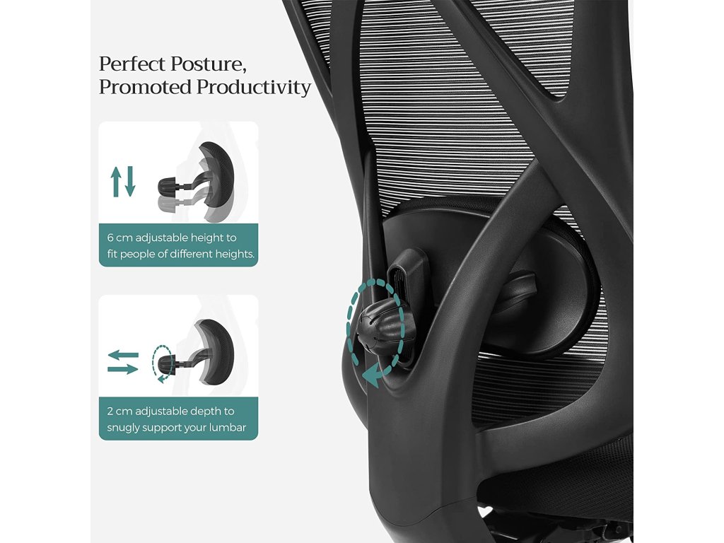 Kancelářská ergonomická síťovaná židle k počítači, nastavitelná bederní opěrka a opěrka hlavy, černá.