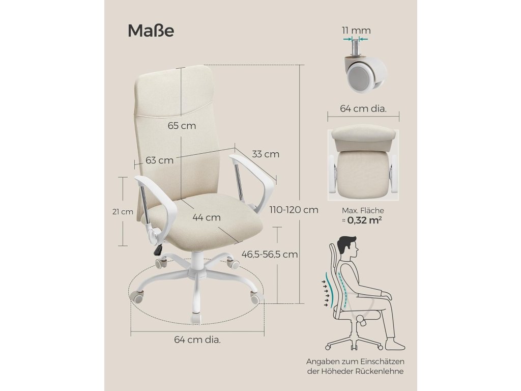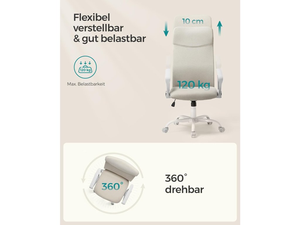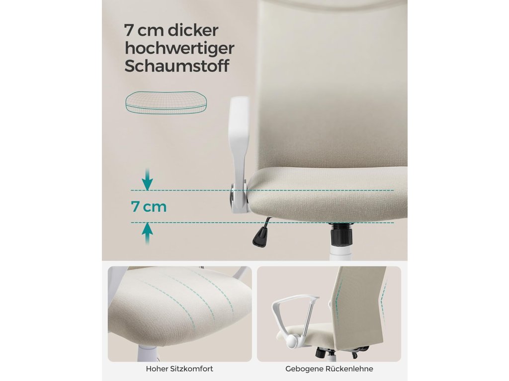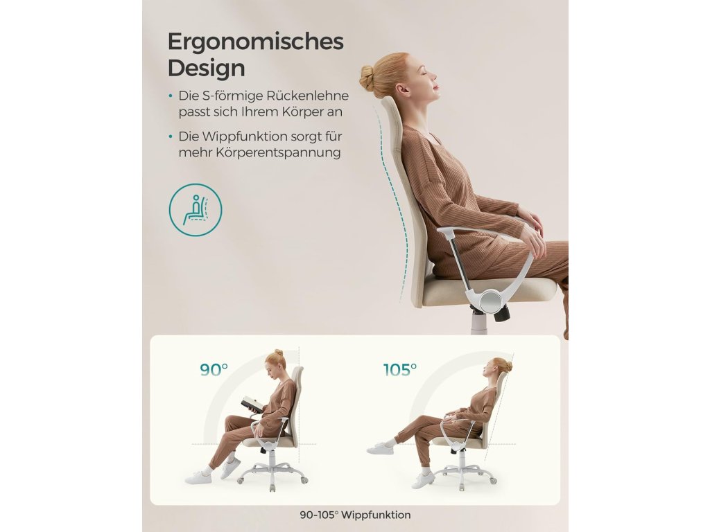 Ergonomické opěradlo: Opěradlo ve tvaru písmene S, které přiléhá k tělu a chrání krk, záda a bederní oblast; funkce houpání 90-105° pro větší uvolnění těla.Pohodlné sezení 7 cm silná vysoce kvalitní pěna, ne příliš měkká, ne příliš pevná, zmírňuje tlak při dlouhém sezení; Vysoce kvalitní tkanina je pohodlná a prodyšná, vaše tělo může také "dýchat";Stylový vzhled Díky minimalistickému designu a klasickým barvám je tato kancelářská židle stylová, všestranná a lze ji snadno začlenit do vaší domácnosti.Vysoká kvalita Díky prvotřídní plynové tlakové lahvi a robustní mechanické základové desce je tato otočná židle stabilní a unese až 120 kg.Pro snadnou montáž Poskytujeme vám jasné pokyny a označené díly, abyste mohli tuto počítačovou židli sestavit rychle a bez námahy.| Kategorie: | Kancelářské židle |