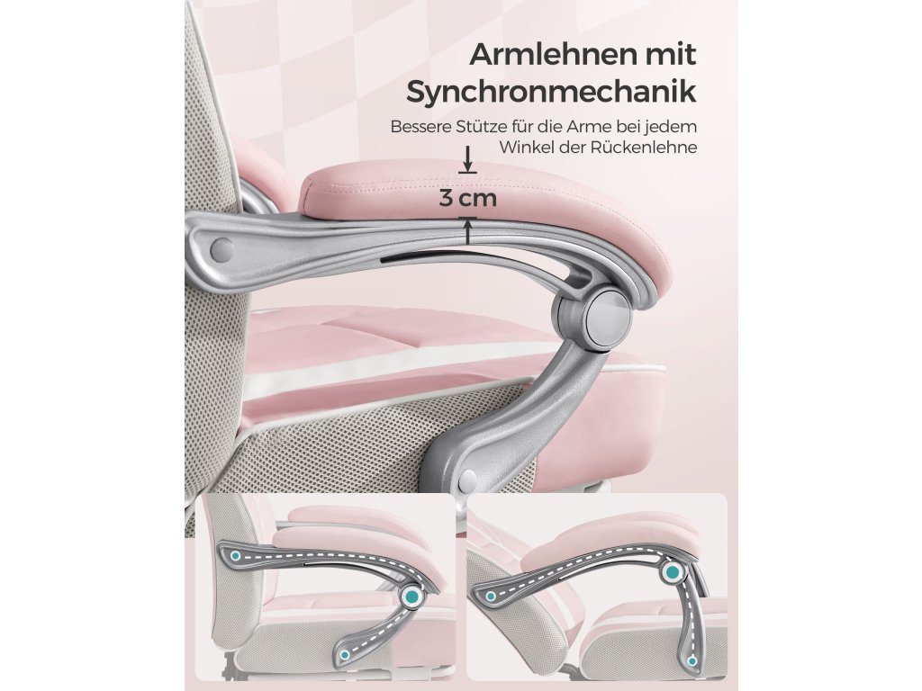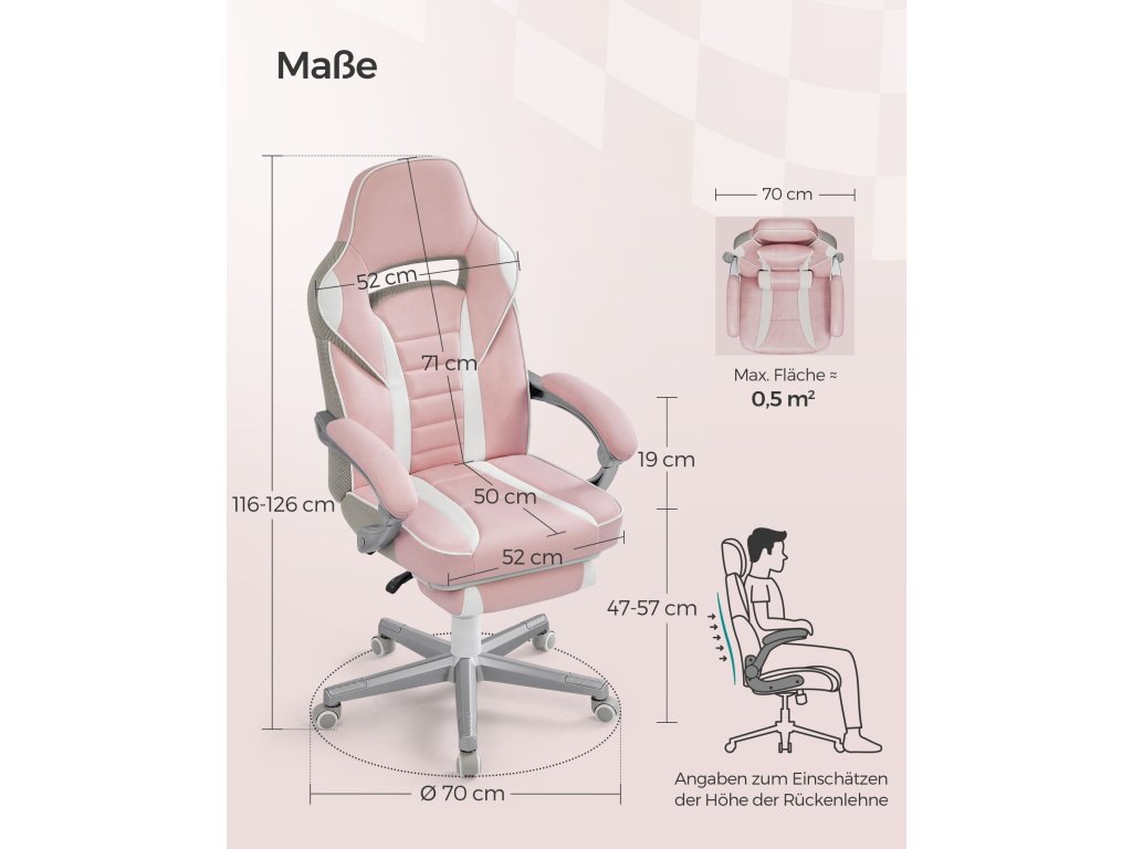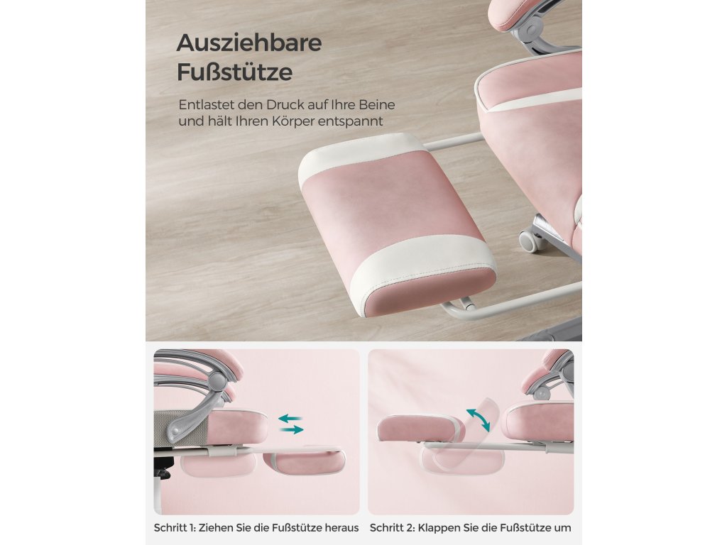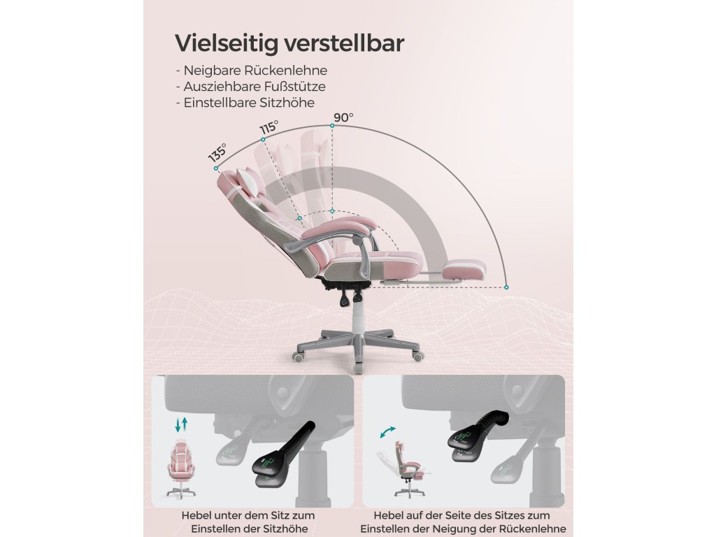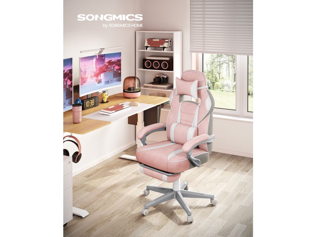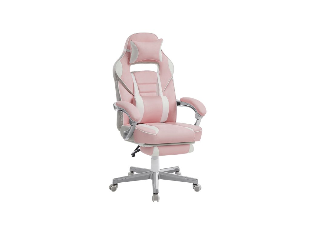 Kancelářská židle, herní židle, nastavitelná, teleskopická opěrka nohou, houpací mechanismus, opěrka hlavy, bederní opěrka, nosnost 150 kg, cukrově růžová a krémově bílá.