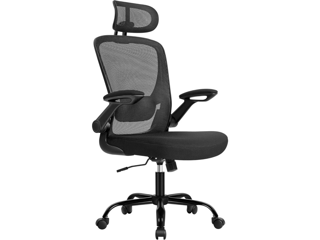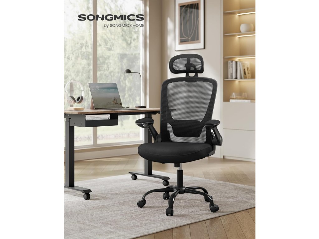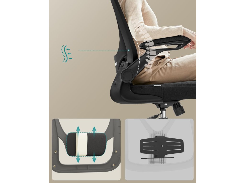 Kancelářská židle, ergonomická kancelářská židle, otočná se síťovinou, čalouněná bederní opěrka, funkce houpání, 53 cm sedadlo, sklopné područky, opěrka hlavy, inkoustová černá.