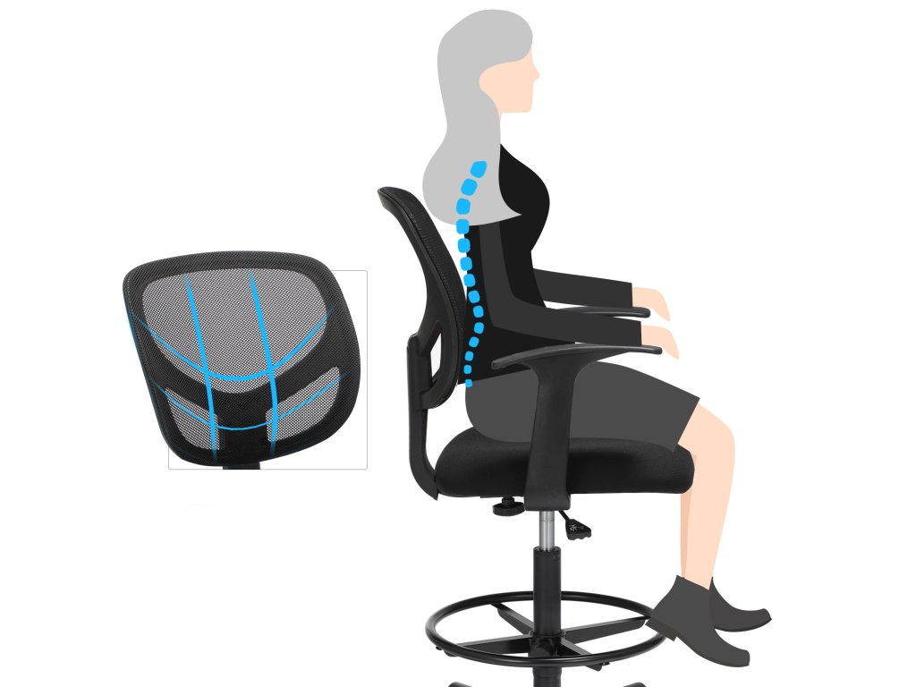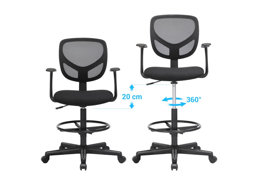 Kancelářská židle, ergonomická pracovní židle s područkami, výška sedáku 55-75 cm, vysoká pracovní židle s nastavitelným kroužkem na nohy, nosnost 120 kg, černá.