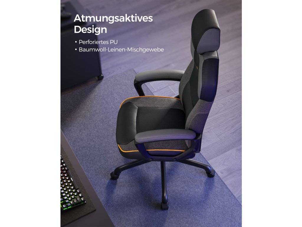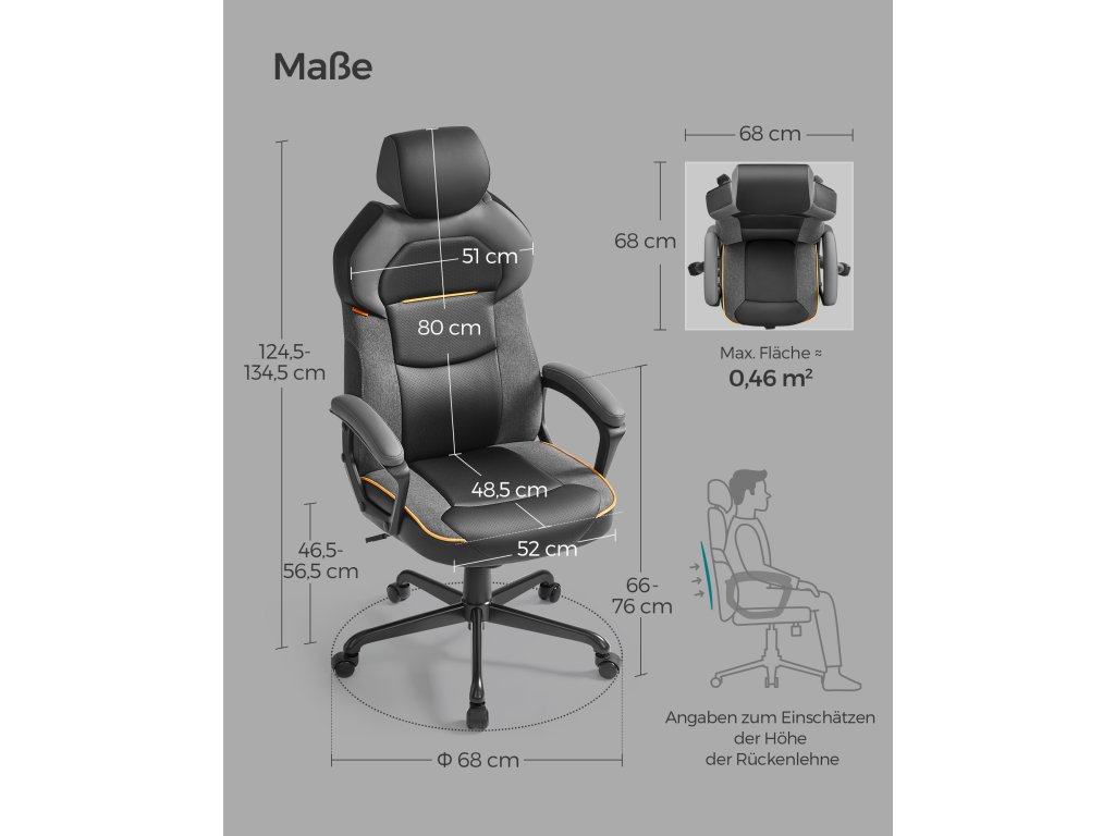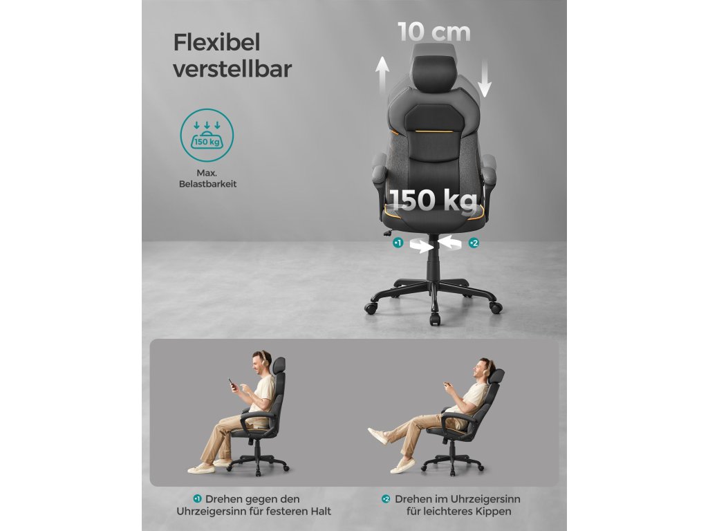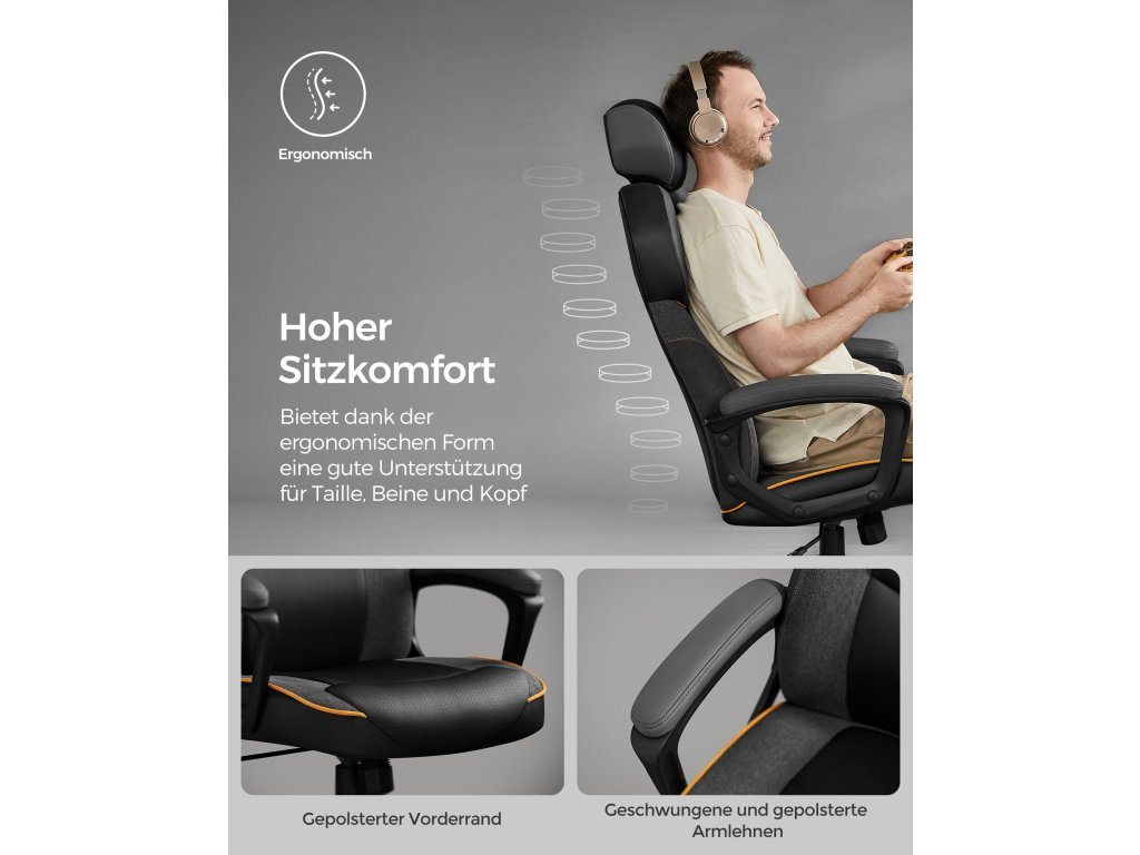 Nastavitelné na více místech: Výška sedadla je nastavitelná v rozmezí 46,5-56,5 cm; nastavitelná opěrka hlavy poskytuje optimální oporu krku a hlavy, vhodná pro uživatele s výškou 170-190 cm; funkce náklonu 95-110° pro relaxaci;Prodyšný povrch: Díky perforovanému PU a směsi bavlněného plátna může vaše tělo "dýchat" i při dlouhém sezení. S touto kancelářskou židlí můžete dát v létě sbohem "lepení".Vysoký komfort sezení Ergonomické opěradlo a dobře polstrovaný sedák snižují tlak na záda a nohy; zakřivená opěrka hlavy poskytuje vysoký komfort pro krk a hlavu; polstrované područky uleví pažím a ramenům;Stabilní a spolehlivá Židle unese až 150 kg a byla testována společností SGS podle normy EN1335 na pevnost a odolnost (zpráva č. AJHL2303000871FT; vlastník: Self-owner/EUZIEL; Výsledek testu potvrzen 26/04/2023) [Robustnost a odolnost] Bezpečnost a odolnost židle byla testována dodavatelem - 120 000krát v bezpečnostní zkoušce tlakové plynové lahve, jednu minutu ve statické tlakové zkoušce základny o hmotnosti 1 136 kg a 100 000krát v cyklické zkoušce koleček;Stylish Look Inspirováno sedadlem závodního vozu kombinace černé PU a bavlněné lněné tkaniny s oranžovými liniemi působí sportovně a je velmi vhodná do herny nebo pracovny.| Kategorie: | Kancelářské židle |