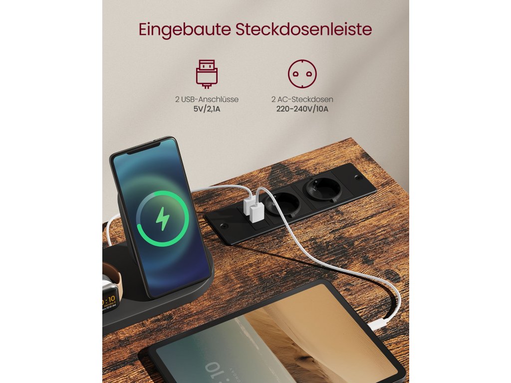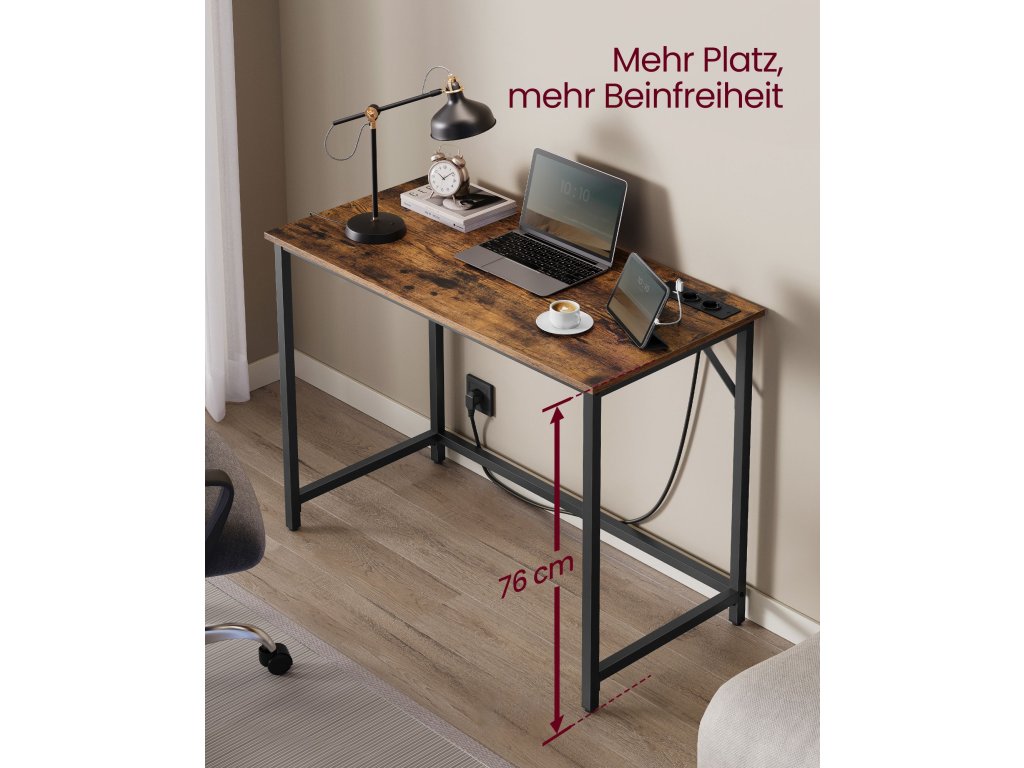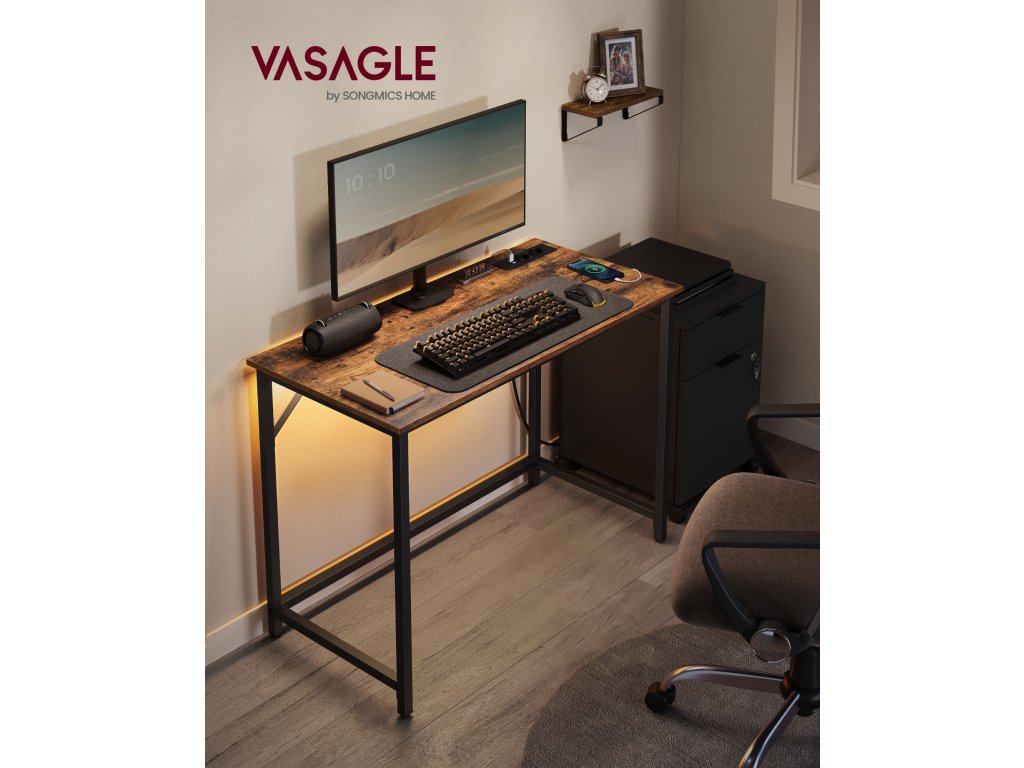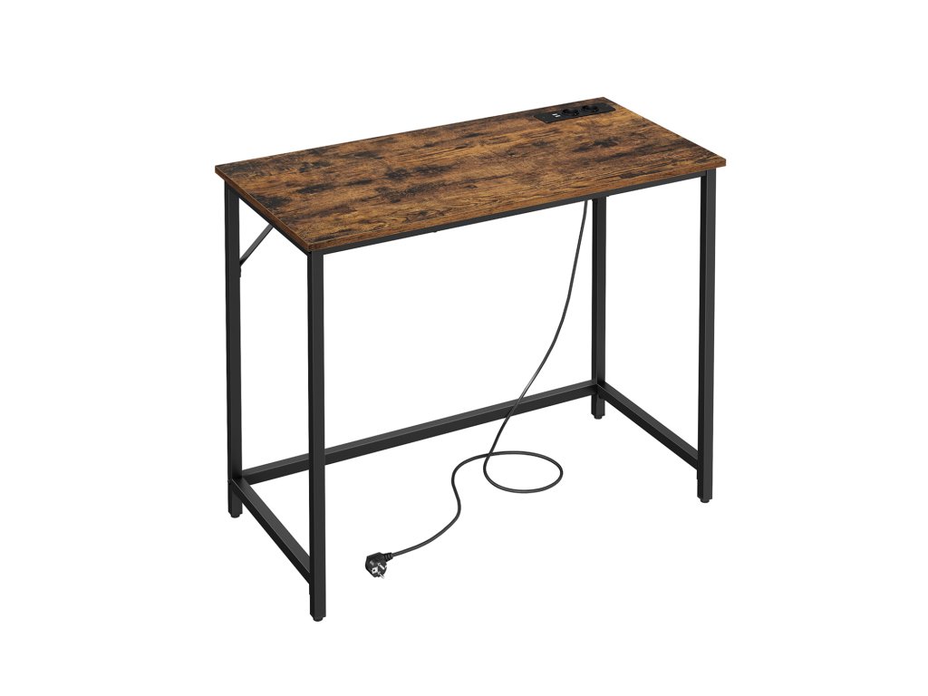 Kancelářský stůl s LED osvětlením, napájecí lišta, počítačový stůl, 50 x 100 x 76, úspora místa, do pracovny, domácí kanceláře, vintage hnědo-černý inkoust.