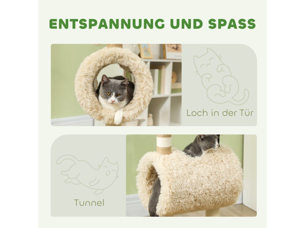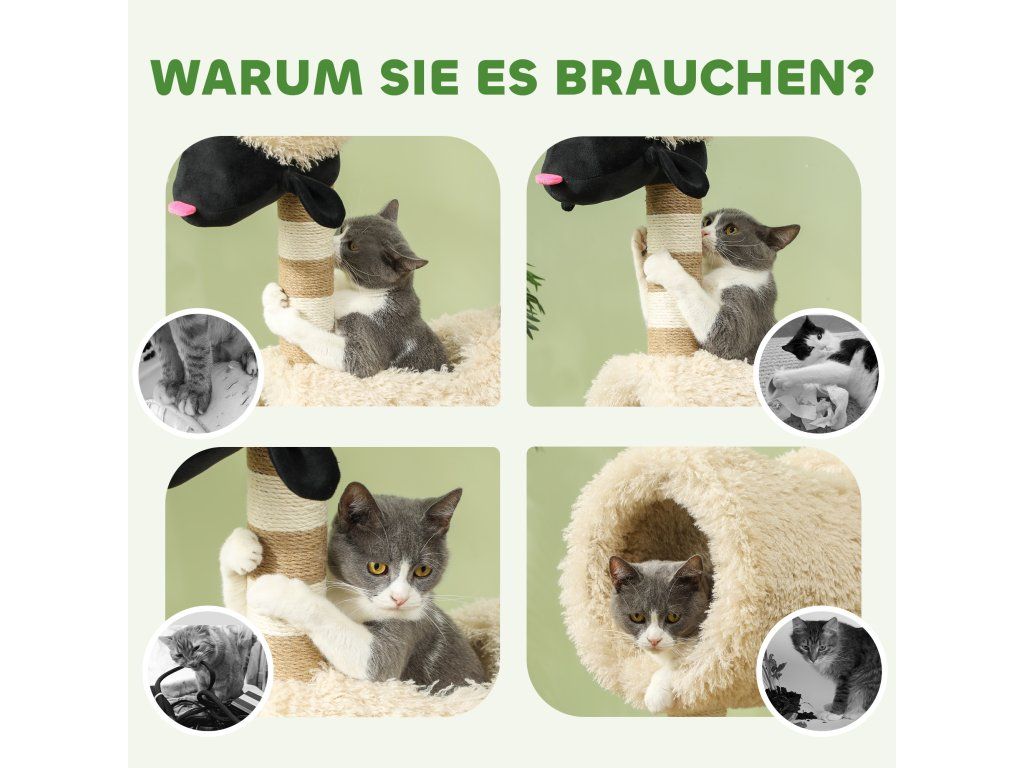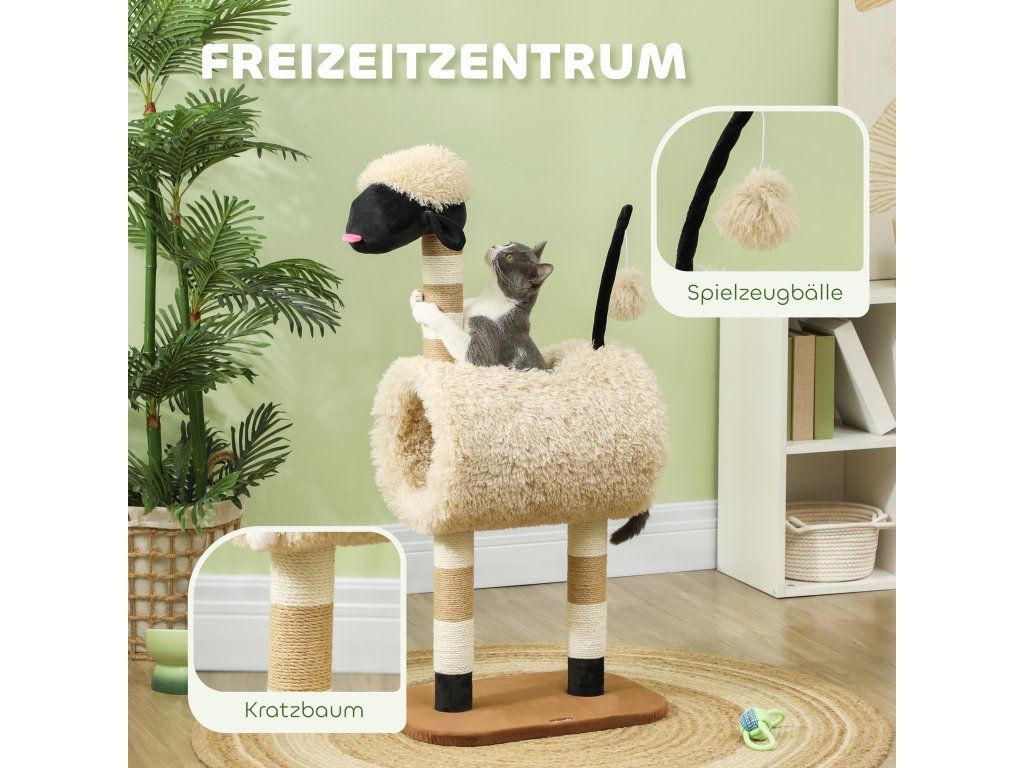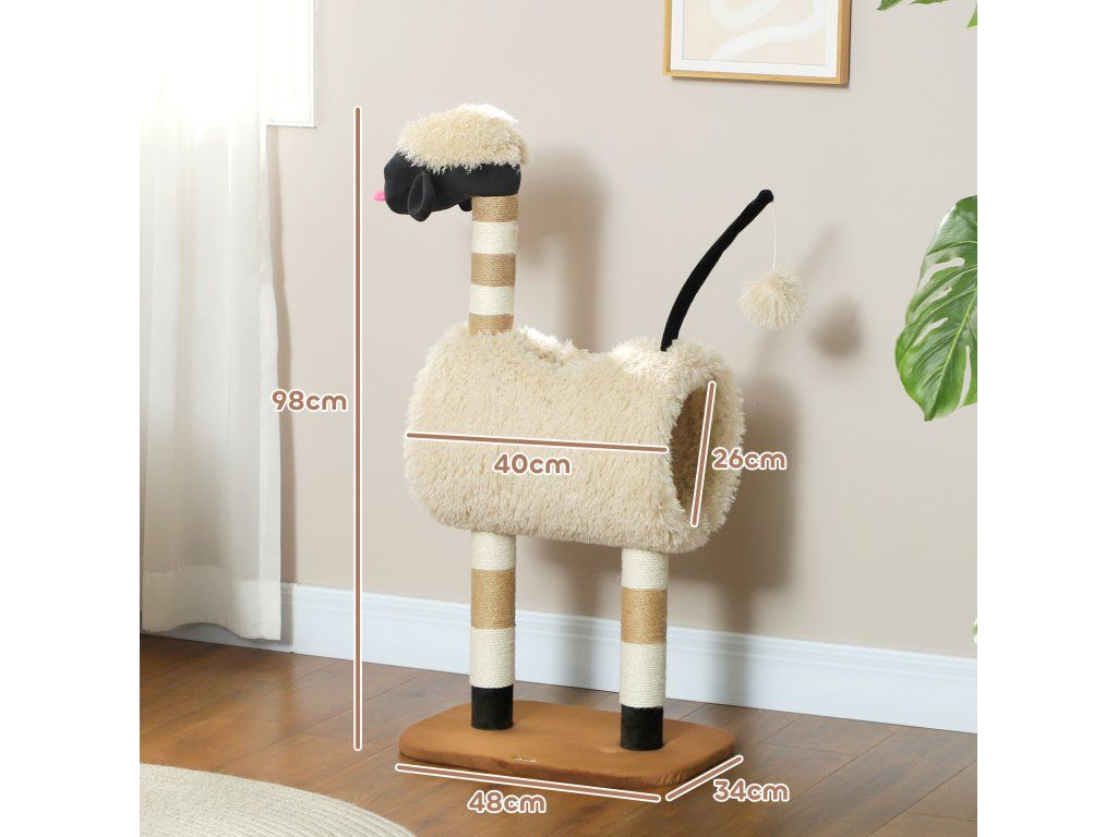 Objevte kočičí strom – hravý ráj pro vaši kočku! Tento kočičí strom s rozkošným motivem ovečky s černým nosem, škrabadly, vzrušujícím tunelem a závěsnou hračkou probudí zvědavost vašeho kočičího kamaráda. Zabalený v měkkém plyši poskytuje útulné místo pro kočky do 5 kg. Dopřejte svému milovanému mazlíčkovi nekonečnou zábavu!