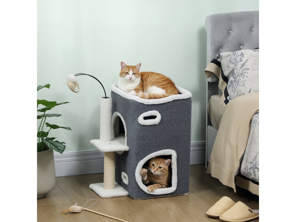 Dvoupatrový kočičí byt: Unikátní dvoupatrový design tohoto kočičího stromu vytváří soukromé útočiště pro každou kočku k relaxaci a hraní, což okamžitě dává novým nebo plachým kočkám pocit bezpečí a sounáležitosti.