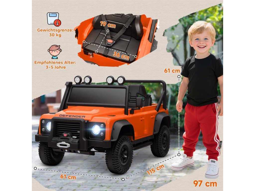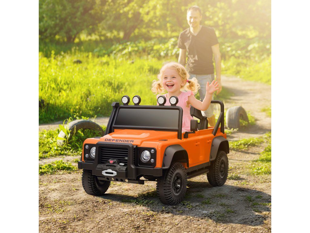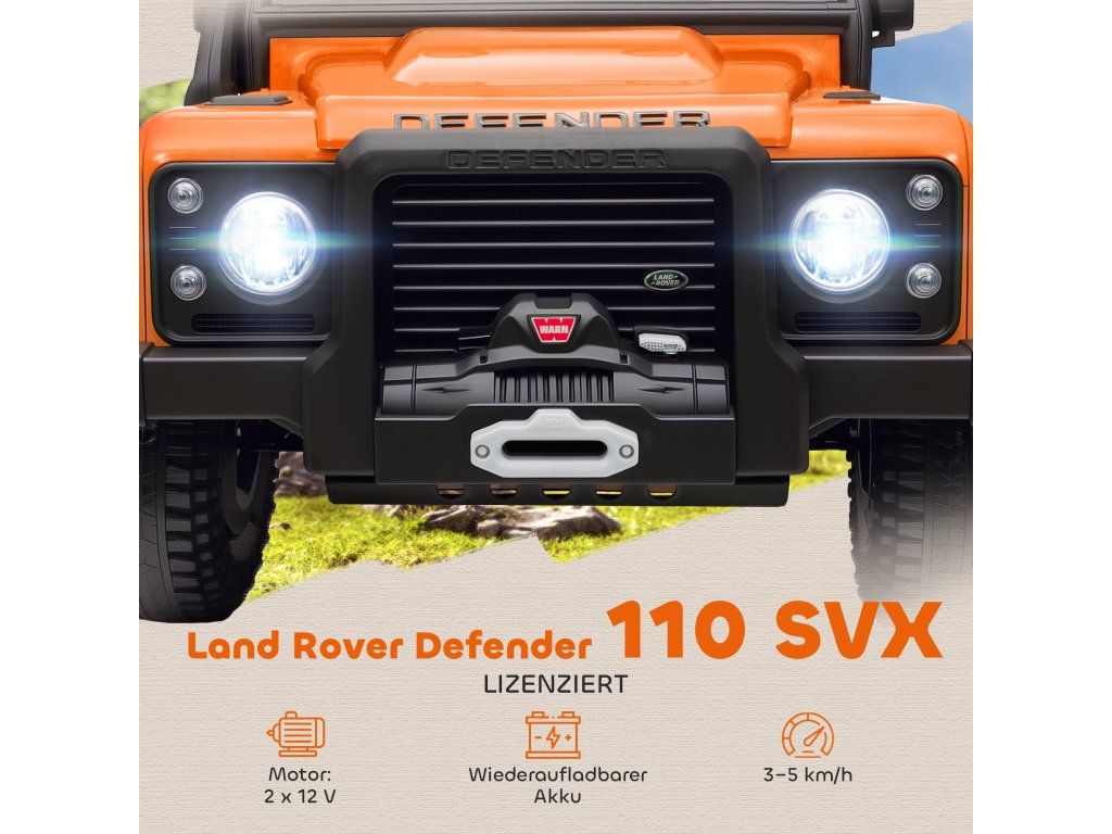 Oficiální Land Rover Defender 110 SVX: Toto dětské elektrické autíčko má dveře, které se otevírají na obě strany, funkční světlomety, klakson a hudbu na volantu pro autentický zážitek z jízdy, který děti potěší.