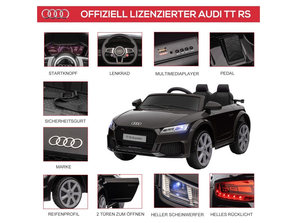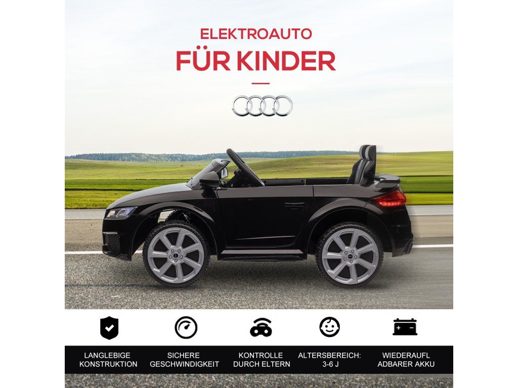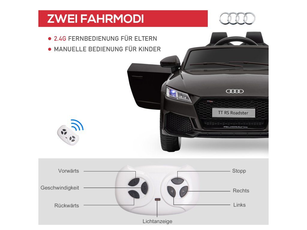 Bezpečná jízda: Toto elektrické dětské auto má dvoukřídlé dveře s obráceným chodem, pohodlné sedadlo s bezpečnostním pásem a dálkové ovládání. Režim dálkového ovládání 2,4 G je vhodný pro mladší děti, zatímco elektrický režim je vhodný pro starší děti. Dětská samostatnost se postupně rozvíjí a zároveň si užívají zábavu z volné jízdy.Hlavní vlastnosti: Toto elektrické auto pro děti se pyšní realistickým vzhledem a dojmem, je vyrobeno podle vysokých standardů Audi. Díky jízdě vpřed a vzad, světlometům, zadním světlům, klaksonu a palubní desce si děti užijí skutečně autentický zážitek z jízdy. Hudbu lze také přehrávat přes USB port vozu, což jízdu činí příjemnější a realističtější.