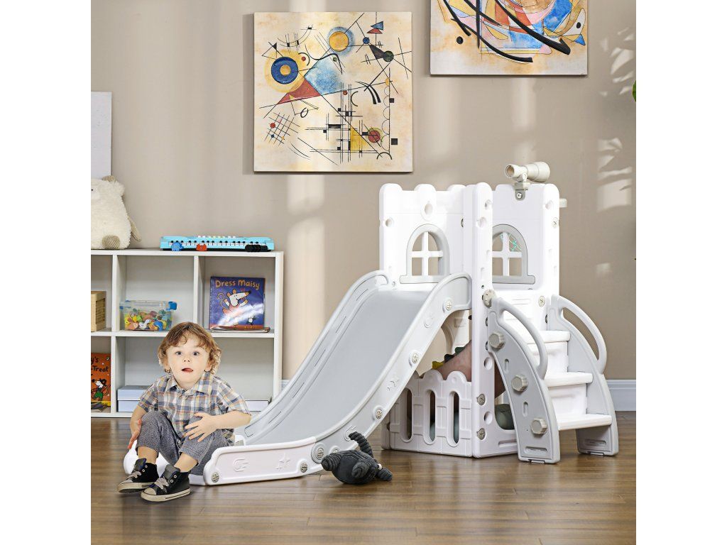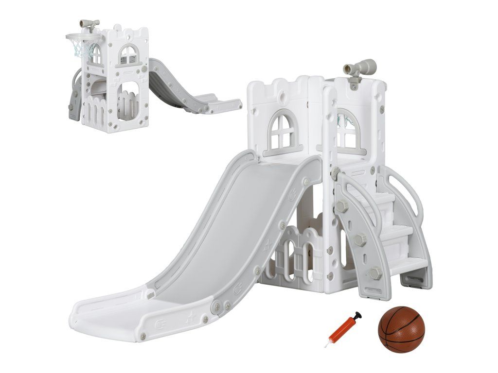 Zábava 5 v 1: Tato dětská skluzavka kombinuje skluzavku, basketbalový koš, dalekohled, úložný koš a prolézačku pro hodiny zábavy a dobrodružství v interiéru.