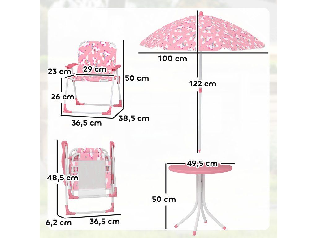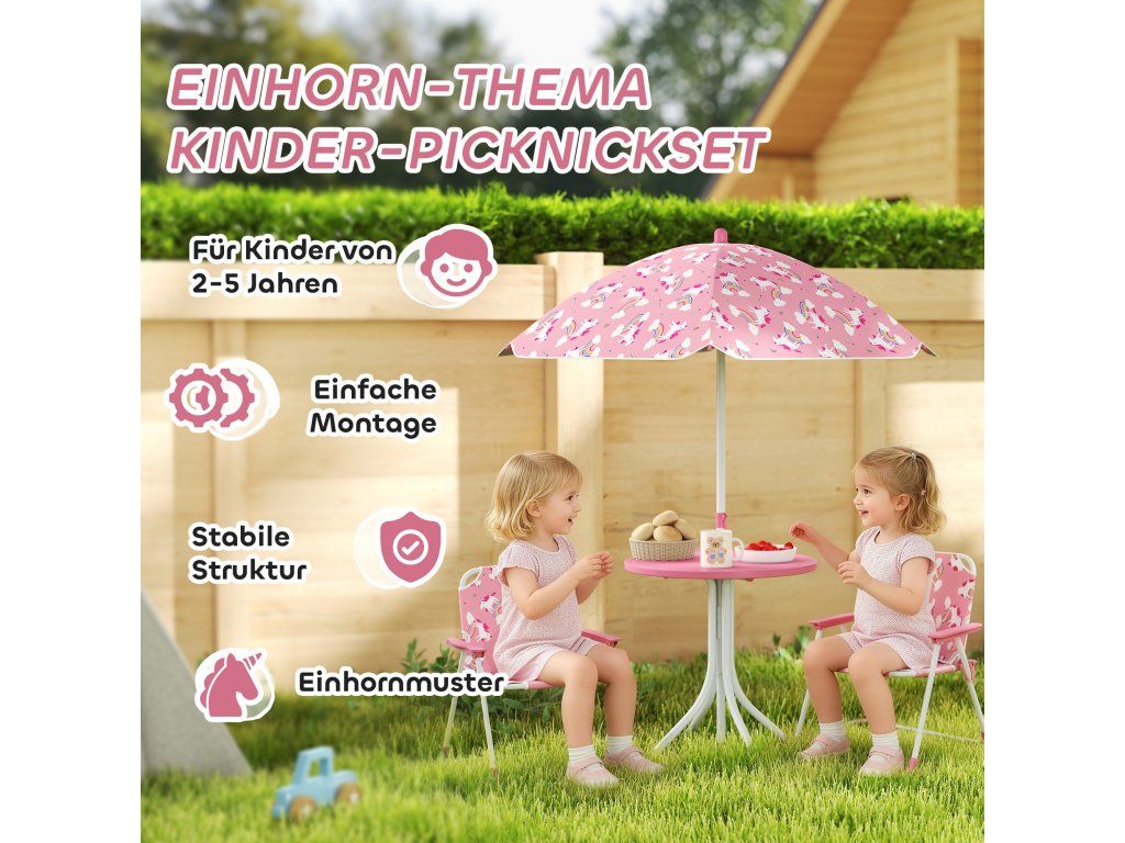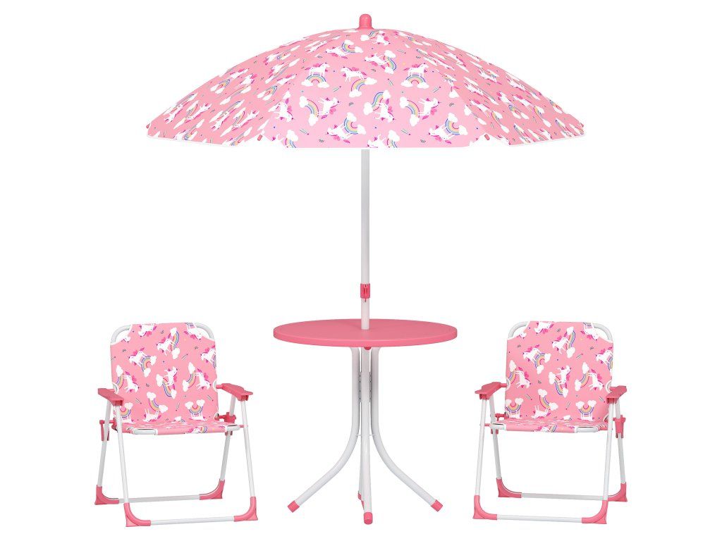 Hravá zahradní sada: Tato dětská Sada sezení obsahuje dvě skládací židle, kulatý stůl a výškově nastavitelný slunečník s atraktivním vzorem jednorožce, ideální pro společné hraní venku, pikniky nebo zahradní aktivity.