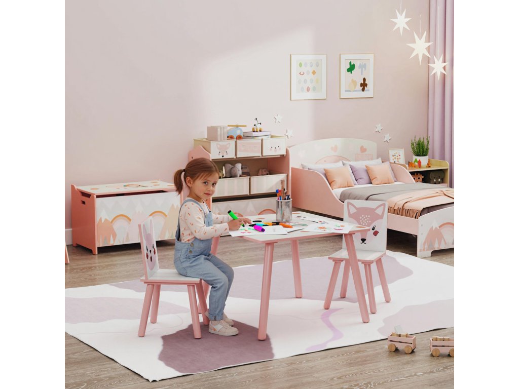 Vytvořte pro své dítě bezpečný a inspirativní prostor s dětskou sedací soupravou. Dětský stůl se dvěma židlemi nabízí ideální velikost pro kreativní aktivity a pohodové učení. Díky robustní konstrukci z MDF desky s certifikací FSC a masivního dřeva si můžete v klidu odpočinout, zatímco si vaše dítě hraje a učí se. Barevné motivy zvířat podněcují fantazii a promění každou chvíli v radostný zážitek.