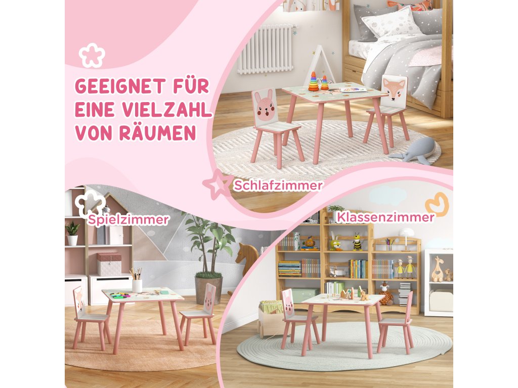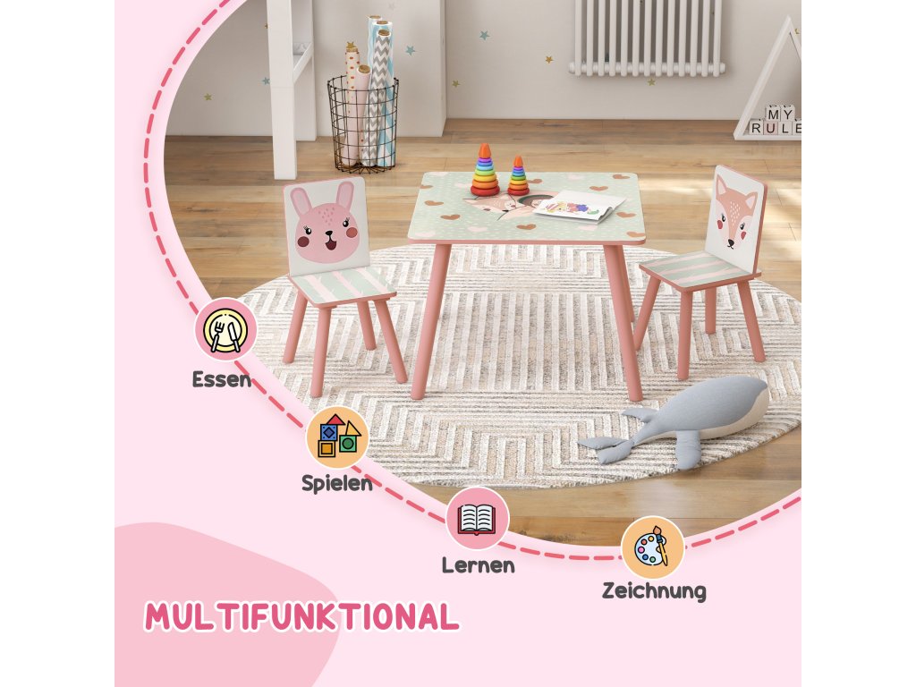 Bezpečné a stabilní: Sada dětského stolu a židlí je vyrobena z MDF s certifikací FSC a masivního dřeva se zaoblenými hranami. Židle unese 30 kg a stůl 20 kg, což zajišťuje bezstarostná a bezpečná dobrodružství doma.