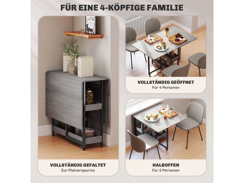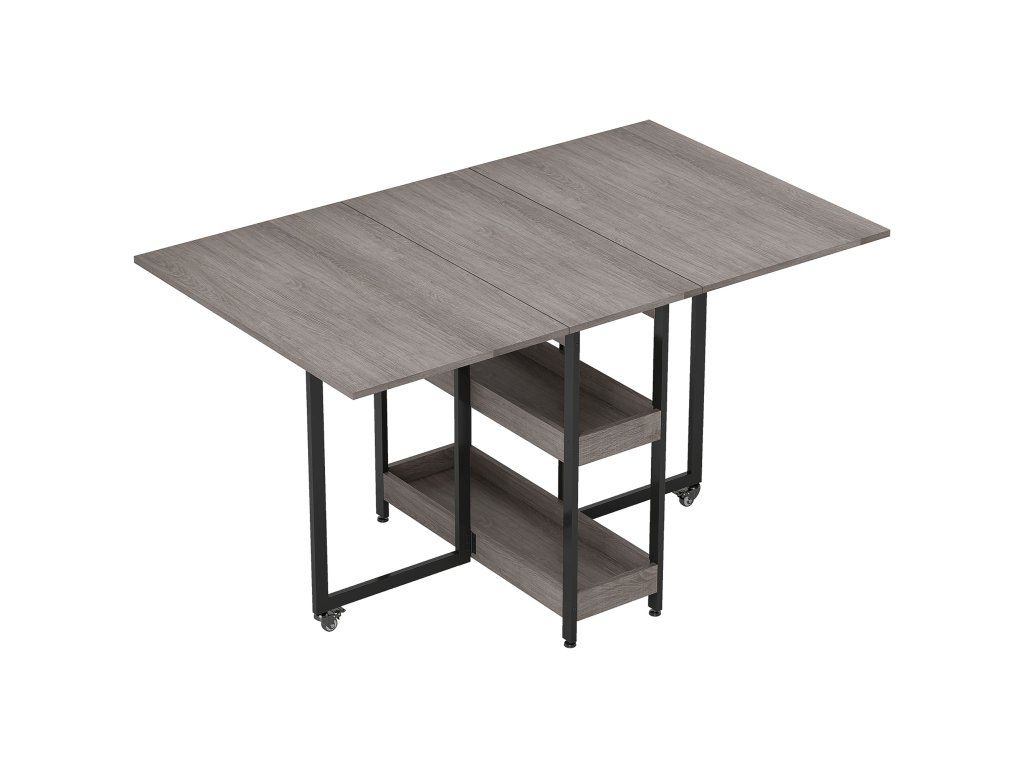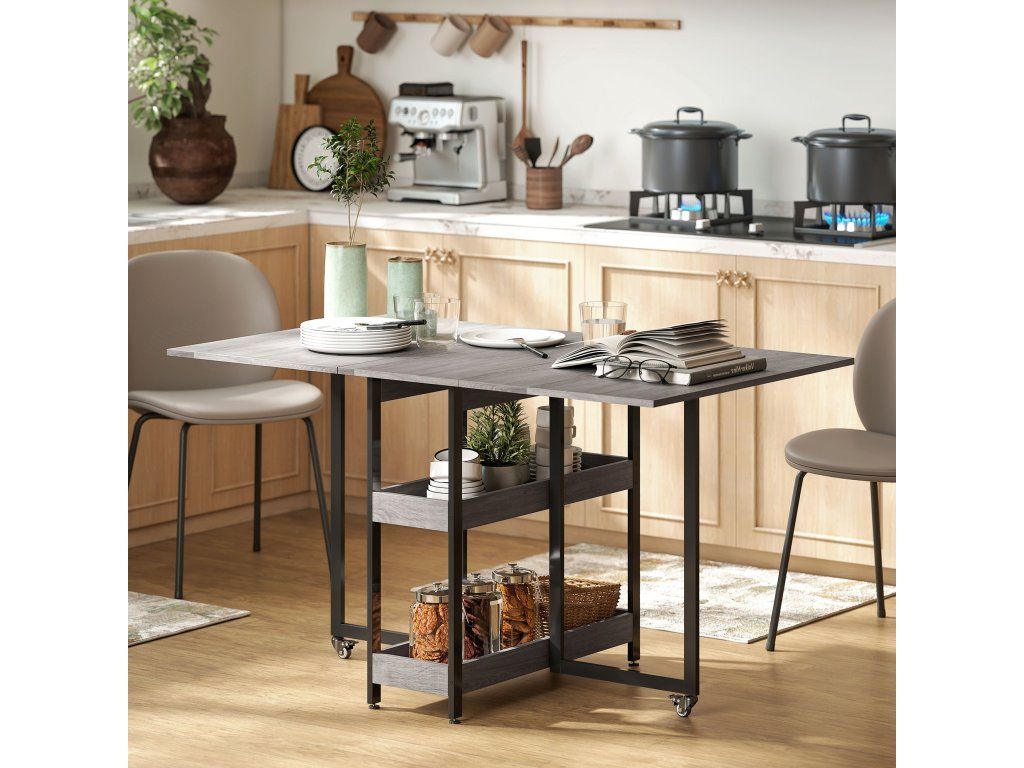 Hledáte všestranný jídelní stůl, který se přizpůsobí vašemu životnímu stylu? Pak je pro vás tento rozkládací stůl ideální: Je ideální do malých prostor a pojme až čtyři osoby. Dvě rozkládací desky stolu umožňují flexibilní použití a otevřené přihrádky bezpečně udrží různé předměty na místě. Díky pevnému rámu a hladce se otáčejícím kolečkům s brzdami se snadno skládá a bezpečně rozkládá.