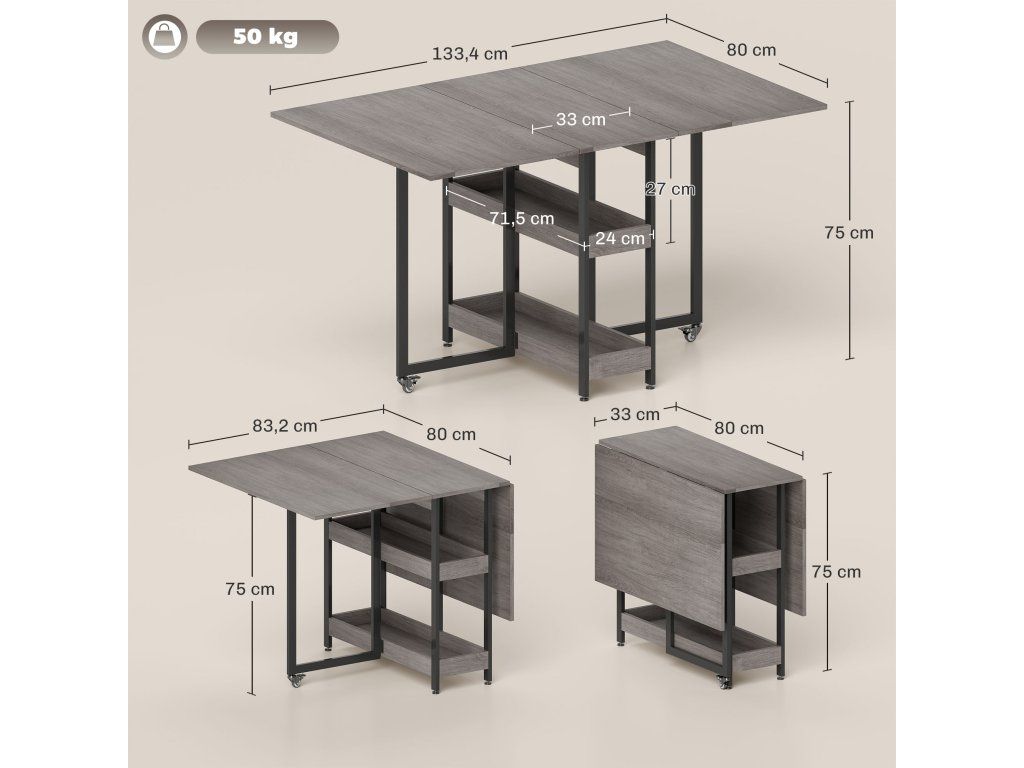 ✔ Nosnost: 50 kg (celkem), 10 kg (skládací křídlo), 30 kg (deska stolu), 20 kg (otevřené přihrádka)