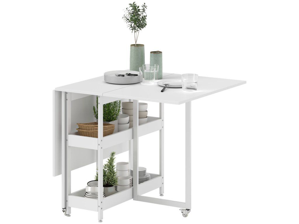 Hledáte všestranný jídelní stůl, který se přizpůsobí vašemu životnímu stylu? Pak je pro vás tento rozkládací stůl ideální: Je ideální do malých prostor a pojme až čtyři osoby. Dvě rozkládací desky stolu umožňují flexibilní použití a otevřené přihrádky bezpečně udrží různé předměty na místě. Díky pevnému rámu a hladce se otáčejícím kolečkům s brzdami se snadno skládá a bezpečně rozkládá.