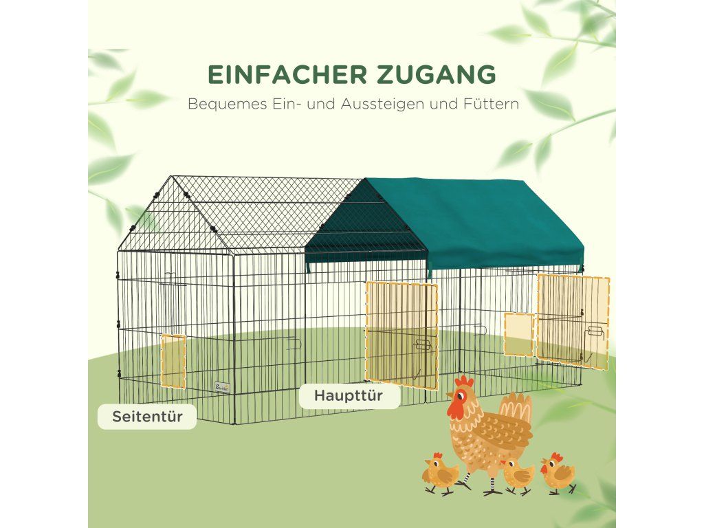 Snadný přístup: Pohodlné přední dveře umožňují domácím mazlíčkům i majitelům snadný přístup, což usnadňuje krmení a čištění. Otevřená podlaha umožňuje vašim zvířatům přirozeně se pást na trávě, takže jsou aktivní, spokojení a ve spojení s přírodou.