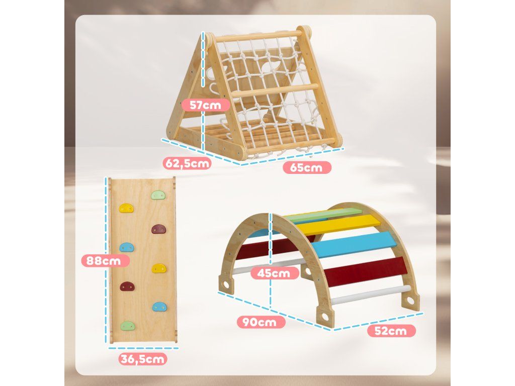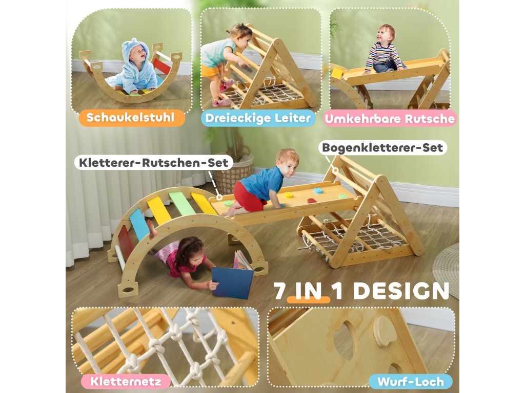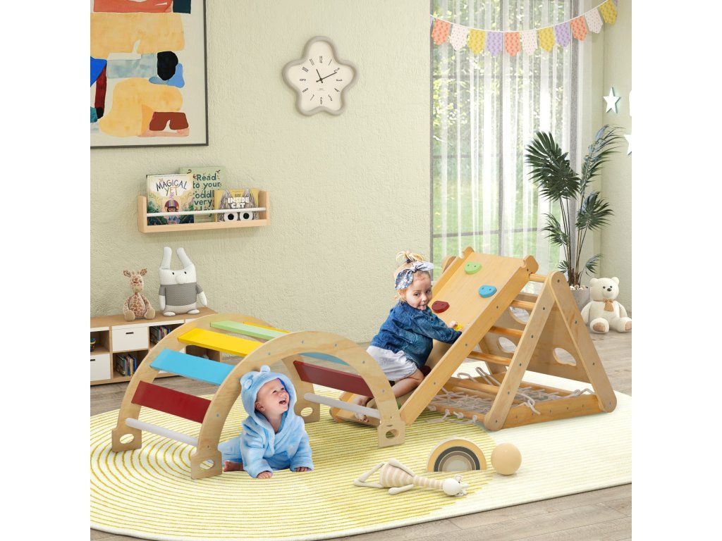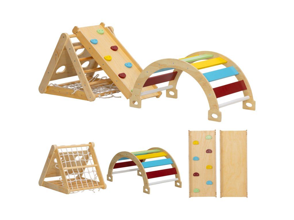 Probuďte dobrodružného ducha svých dětí s vnitřní lezeckým rámem. Tato sada 7 v 1 nabízí všestranné možnosti hraní, včetně lezeckého trojúhelníku, lezecké sítě a skluzavek, a podporuje hravou koordinaci a přátelství. Lezecký rám je vyroben z bezpečného borovicového dřeva, poskytuje bezstarostnou zábavu a perfektně se hodí do každé místnosti.