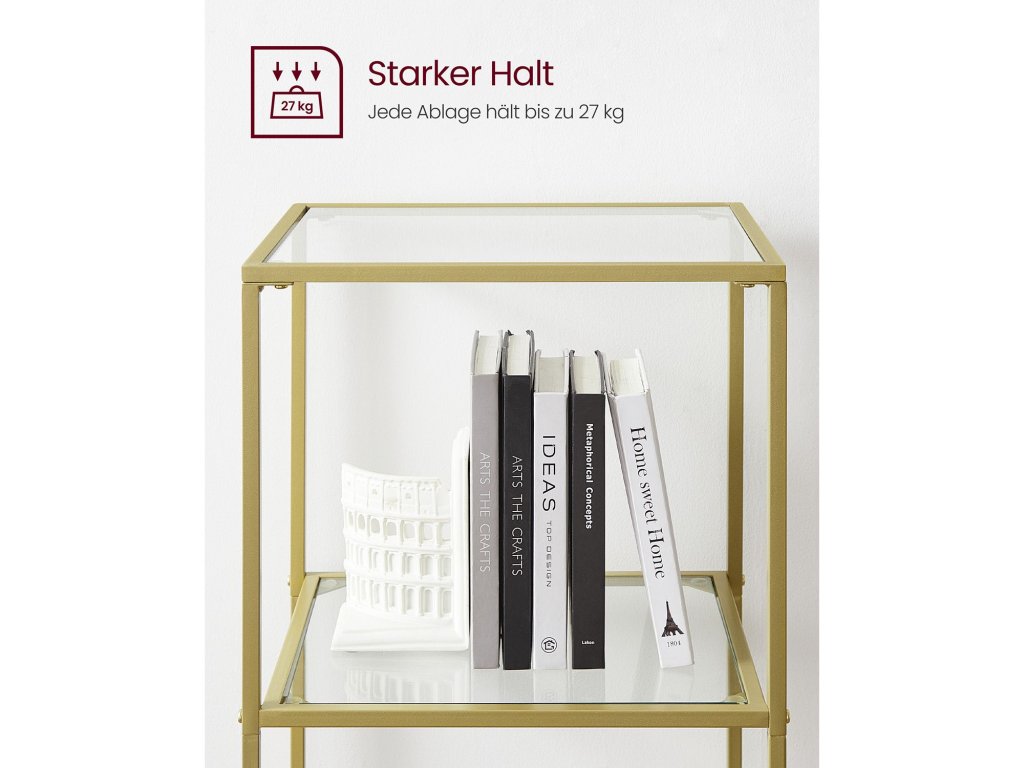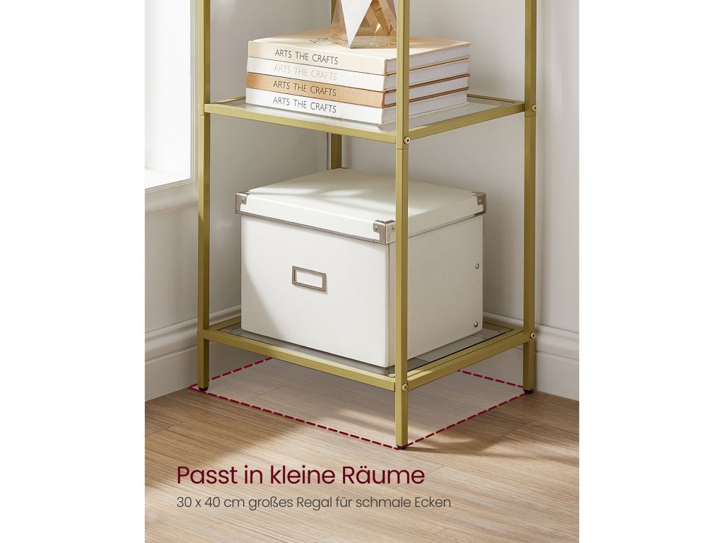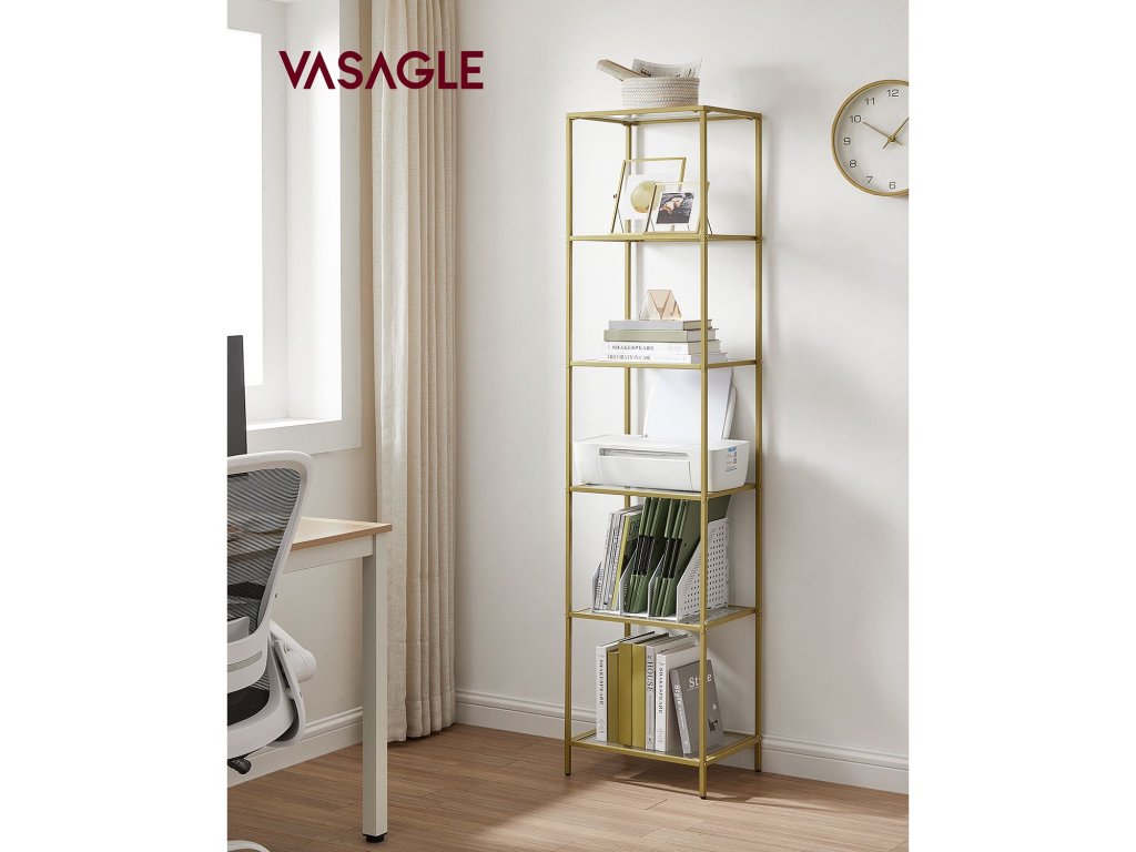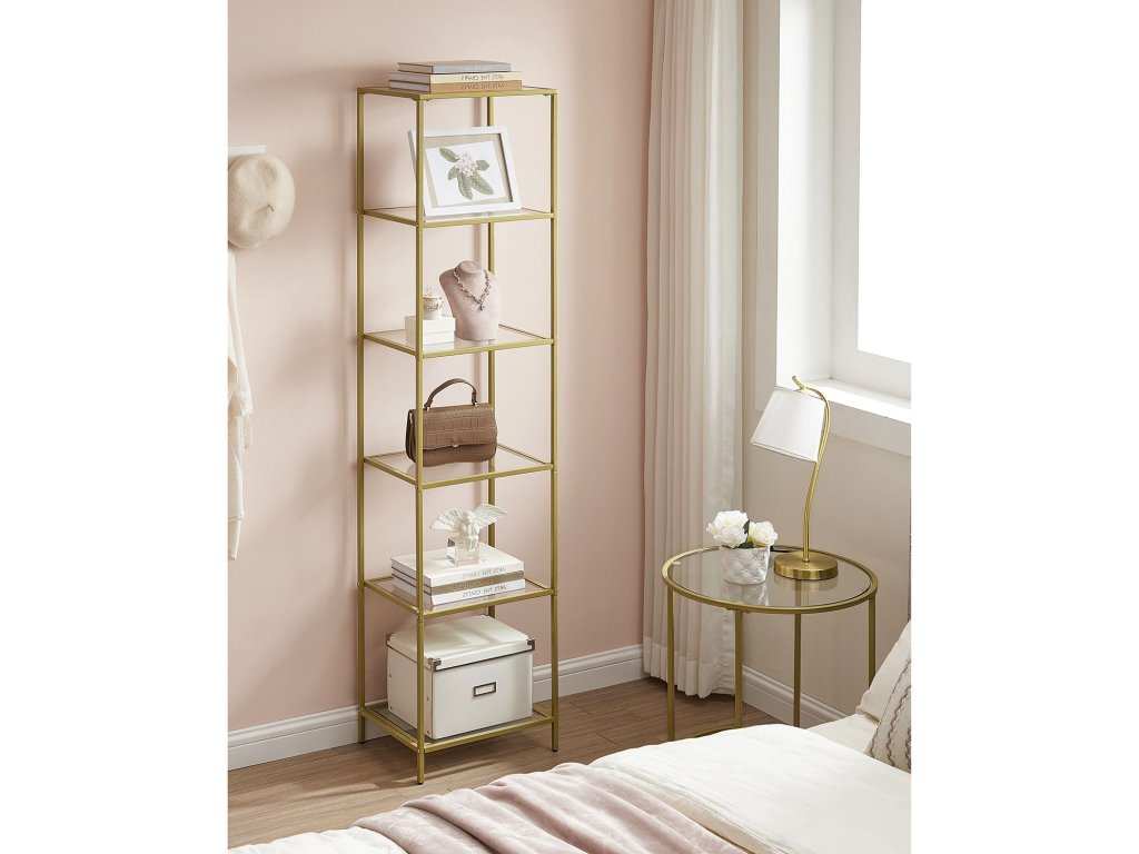 Knihovna, 6patrová police na knihy, tenký regál do ložnice, koupelny, domácí kanceláře, tvrzené sklo, ocelový rám, zlatá metalíza.