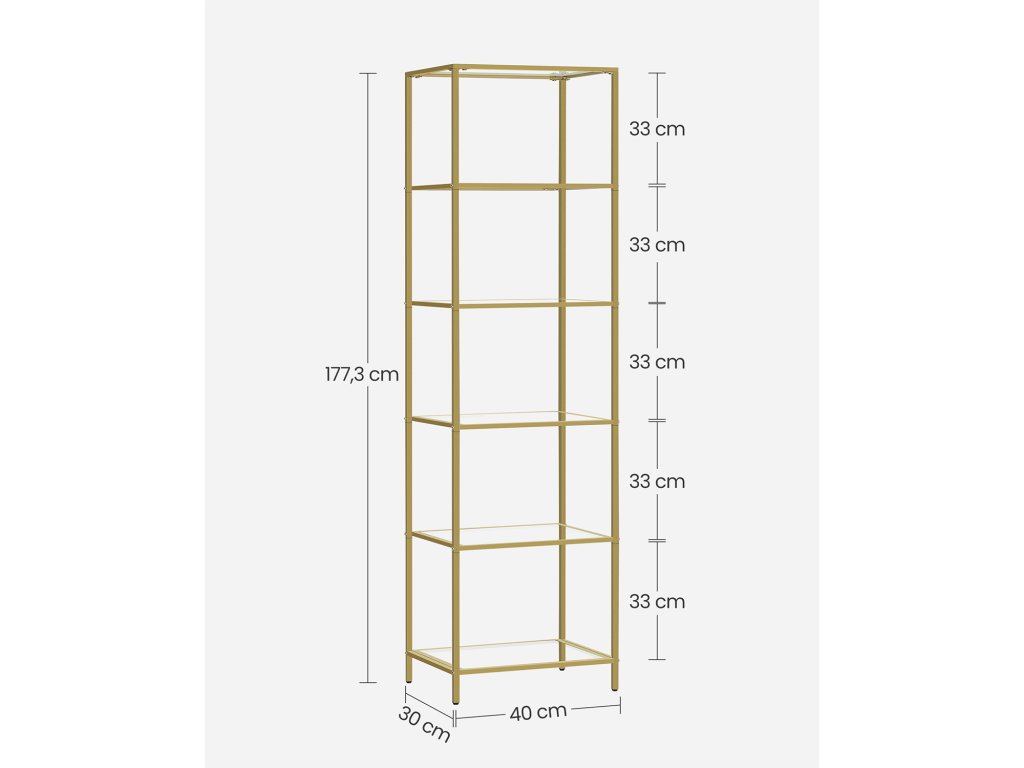 Display Your Faves Tato šestipatrová police s průhlednými skleněnými policemi a zlatým rámem se pyšní úžasným moderním minimalismem. Tato vysoká police vám umožní vystavit zeleň, knihy a sběratelské předměty a zároveň pozvedne vzhled vašeho prostoru.6 úrovní pro maximalizaci prostoru Tento šestipodlažní otevřený regál s výškou 69,8" zabírá pouze 11,8 "D x 15,7 "Š a umožňuje plně využít vertikální prostor pro skladování.Bezproblémová montáž S montáží této úzké police si nemusíte dělat starosti. Jasný návod a očíslované díly vám pomohou ji snadno dokončit.One Rack Mnohostranné využití Úzká police na knihy v kanceláři? Polička na drobnosti v obývacím pokoji? Otevřená police na fotografie v ložnici? Tento úzký regál se šesti patry vám pomůže.Robustní a stabilní Tato hubená knihovna vyrobená ze 4 mm silného tvrzeného skla a ocelového rámu je velmi robustní. Nastavitelné nožičky zvyšují stabilitu a sada proti překlopení zvyšuje bezpečnost.| Kategorie: | Knihovny |