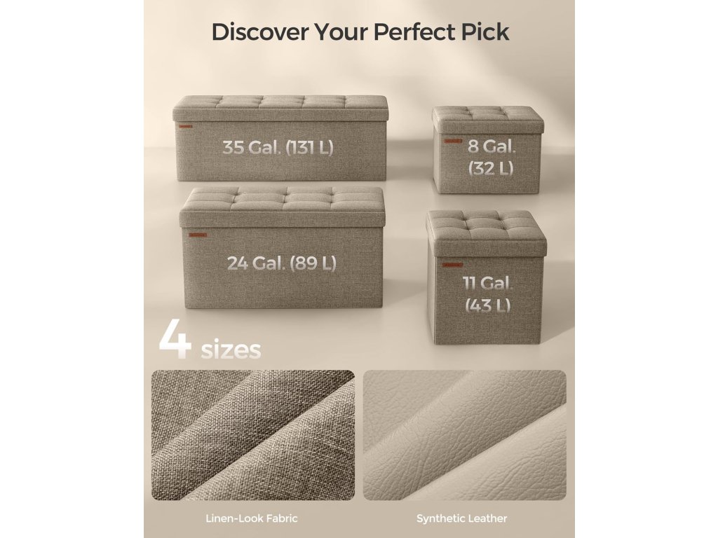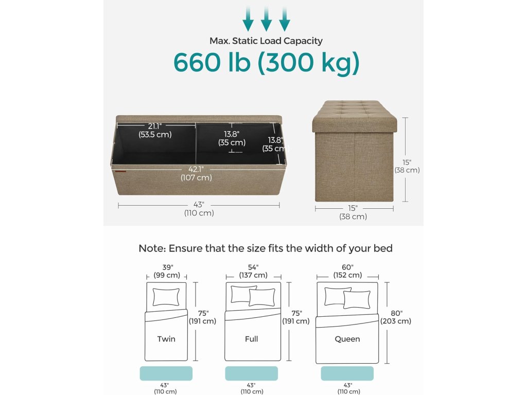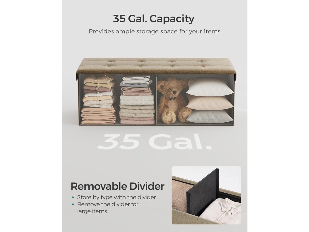 【PŘÍKLAD ÚLOŽNÉHO PROSTORU】 Tato úložná lavice o rozměrech 15 "D x 43 "Š x 15 "V (38 x 110 x 38 cm) nabízí objem 35 galonů (131 l). Díky odnímatelnému rozdělovači jsou v něm přehledně roztříděny knihy, oblečení a přikrývky, nebo do něj můžete uložit větší předměty, například povlečení.