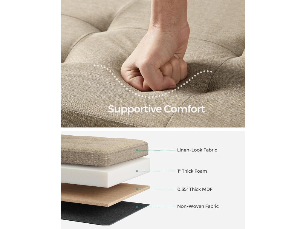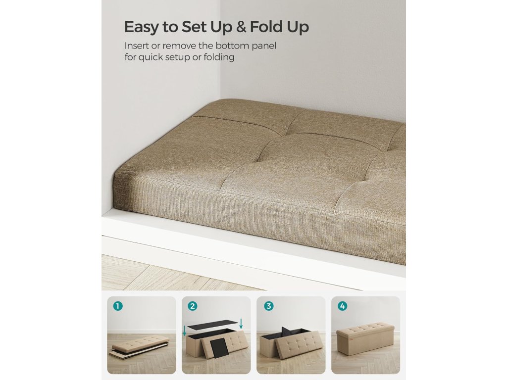 【RYCHLÁ MONTÁŽ, SNADNÉ ROZLOŽENÍ】Tento úložný otoman z kolekce SONGMICS MAZIE má skládací konstrukci, která umožňuje rychlé sestavení během několika sekund pouhým zasunutím spodního panelu. Když ho nepoužíváte, snadno ho složíte a uložíte pod postel nebo do skříně.