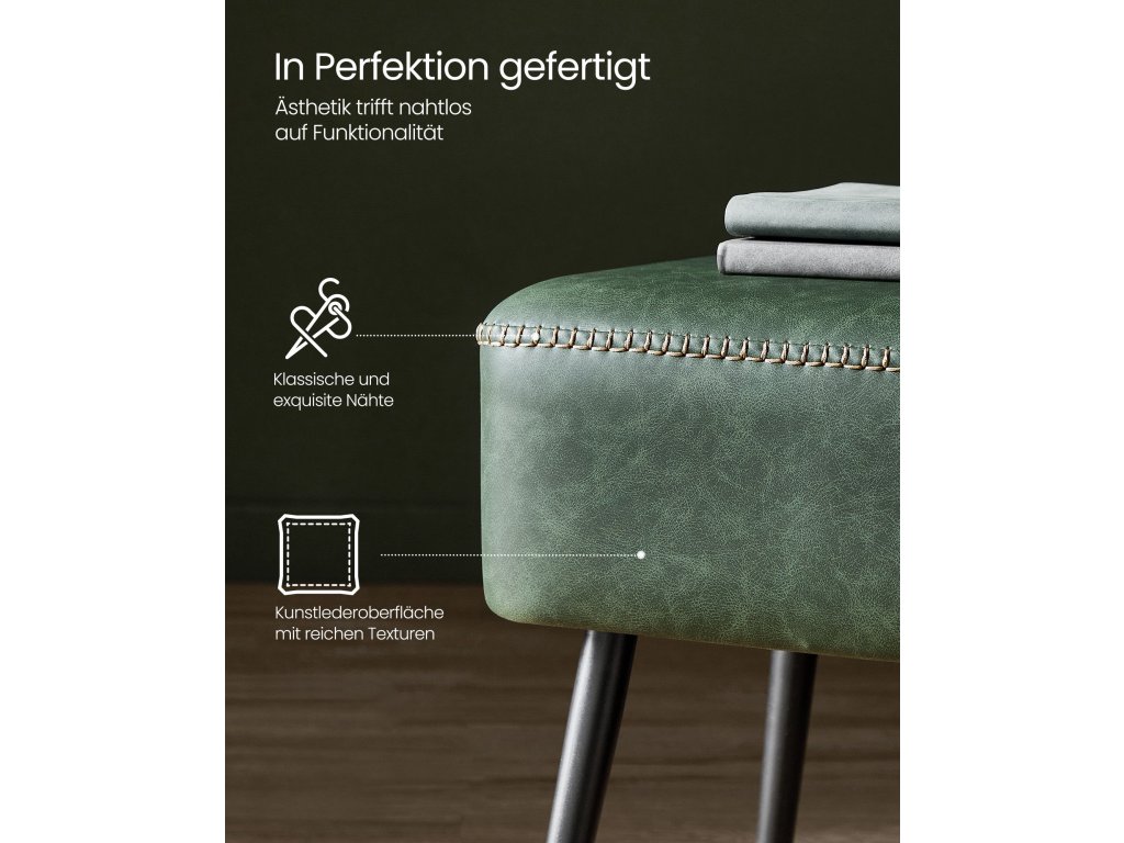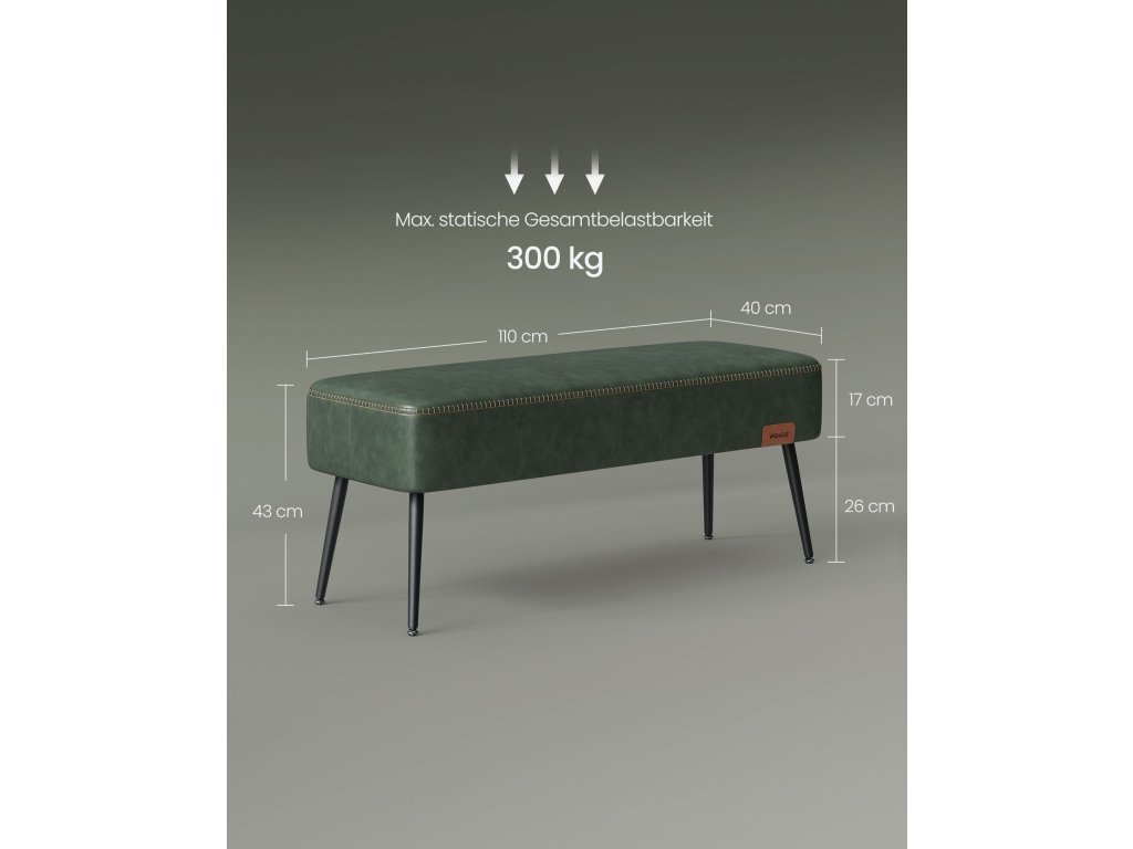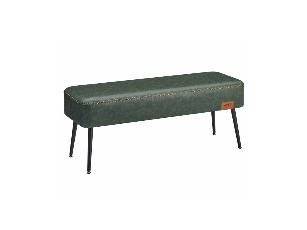 Jídelní lavice, lavice do ložnice, umělá kůže s jemným prošitím, moderní styl poloviny století, moderní, ocelové nohy, nosnost 300 kg, lesní zelená.