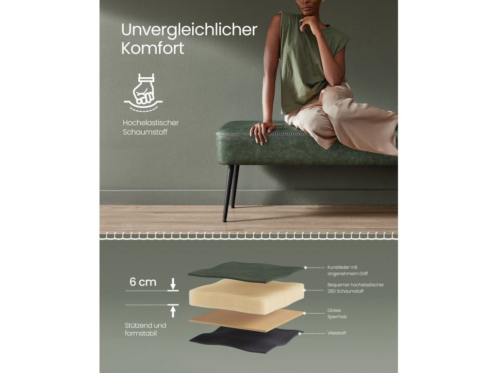 Oživte svůj prostor Tato lavice z kolekce VASAGLE EKHO je vyrobena z umělé kůže s bohatou texturou a jemné prošívání svědčí o řemeslném zpracování. vytvoření domova, který vypovídá o vašem stylu.Robustní a odolná Tato lavice je vyrobena z vysoce kvalitních materiálů a je podepřena robustním ocelovým rámem, který zajišťuje dlouhou životnost. Unese až 300 kg a zajistí, že budete vždy v bezpečných rukou.Pohodlí při každém sezení Přejeďte po hladkém potahu a pak se zabořte do podpůrné 6 cm silné, vysoce elastické pěny 25D. Tato čalouněná lavice poskytuje pohodlné sedadlo, které dlouho vydrží a nedeformuje se.Všestranné Ať už jako okouzlující konferenční stolek, lavička na boty, útulná lavice v ložnici nebo stylové posezení v šatní skříni, toto čalouněné sedátko se bez problémů přizpůsobí všem vašim potřebám.Snadná montáž, snadná údržba: Tato lavice se nejen snadno sestavuje, ale je také vyrobena z umělé kůže odolné proti opotřebení a snadno se udržuje. Stačí podle jasných pokynů připevnit nohy a máte hotovo.| Kategorie: | Lavice do předsíně |