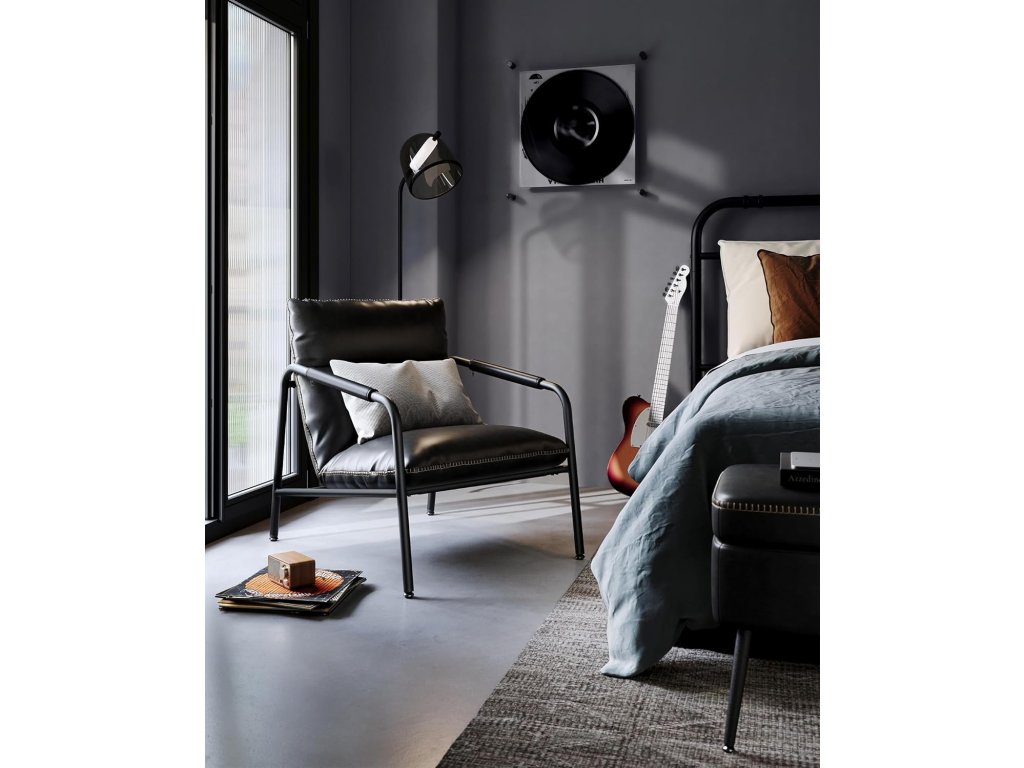 Křeslo do obývacího pokoje, akcentní křeslo s područkami, kovový rám, PU s prošíváním, inkoustově černé.