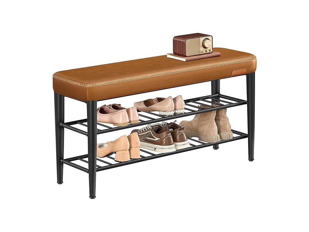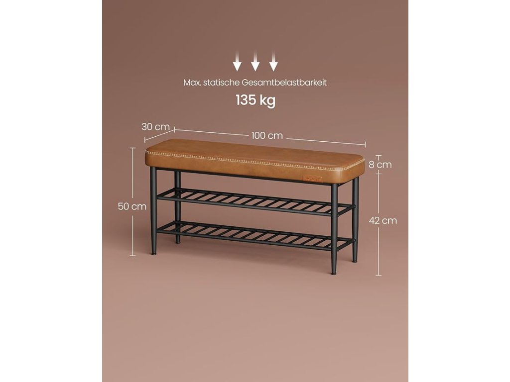 Lavice na boty, sedátko, vstupní prostor, umělá kůže, švy, moderní styl poloviny století, moderní, maximální nosnost 135 kg, 30 x 100 x 50 cm, karamelově hnědá.
