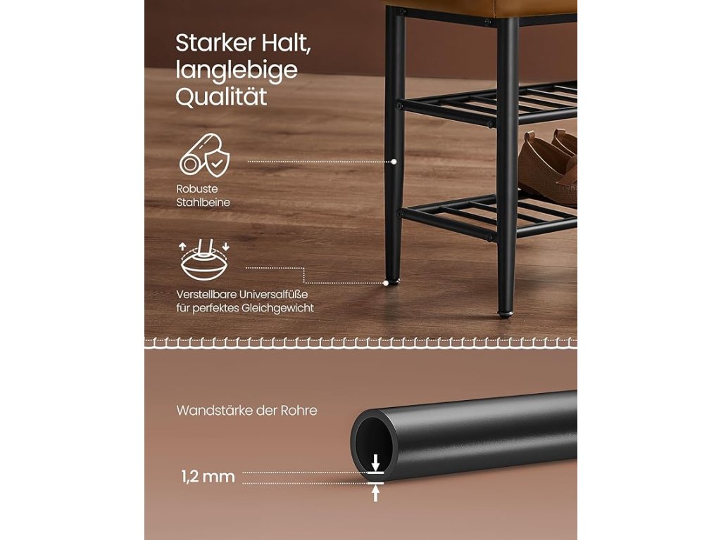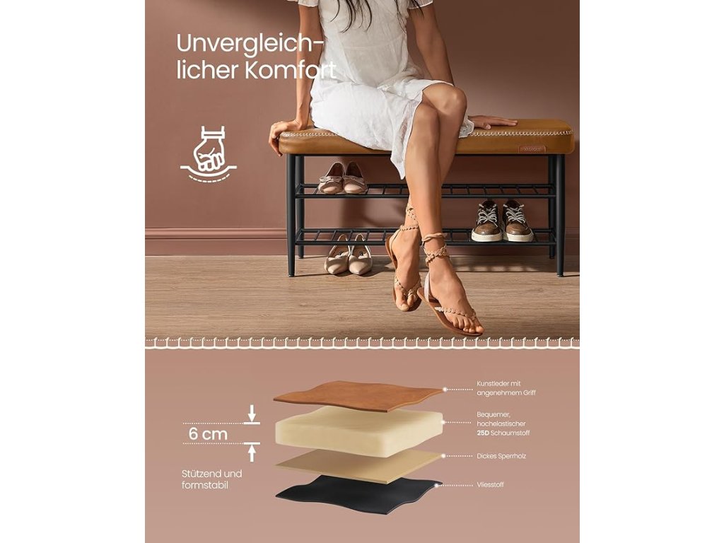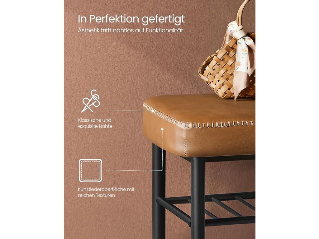 Style Counts Tato lavice na boty z kolekce VASAGLE EKHO, oceněná cenou Bronze A' Design Award 2024, kombinuje umělou kůži s rafinovaným prošíváním. Jako poctu řemeslné zručnosti vytváří domov, který vypovídá o vašem stylu.Pohodlí při každém sezení Přejeďte přes hladký potah a pak se zabořte do 6 cm silné, vysoce elastické pěny 25D, která se nikdy nedeformuje. Tato lavice nabízí skvělé posezení, které obstojí ve zkoušce časemPevné a stabilní: Díky robustnímu ocelovému rámu a nastavitelným univerzálním nohám tato polstrovaná lavice na boty snadno unese až 135 kg. Poskytuje pevné a stabilní držení a je ideální na začátek nebo konec dne.Extra prostor pro uložení, vysavač Spodní police je 10 cm nad zemí a má 3 úrovně pro uložení bot. Je také dostatečně vysoký, aby robotické vysavače udržovaly váš pokoj v čistotě a pořádku.Snadná údržba, snadná montáž: Tato lavice má potah z umělé kůže, který se snadno čistí. Díky přehlednému návodu a přiloženému montážnímu nástroji je montáž hračkou pro maximální pohodlí a komfort.| Kategorie: | Lavice do předsíně |