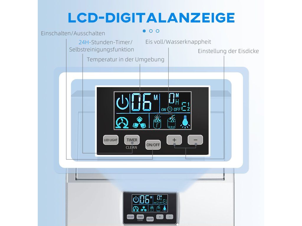 Uživatelsky přívětivý: LCD displej zobrazuje symboly pro nízký stav vody, přívod vody, výrobu ledu, hladinu ledu a pokojovou teplotu, což zajišťuje snadnou obsluhu. Tloušťku ledu lze upravit změnou doby trvání cyklu.