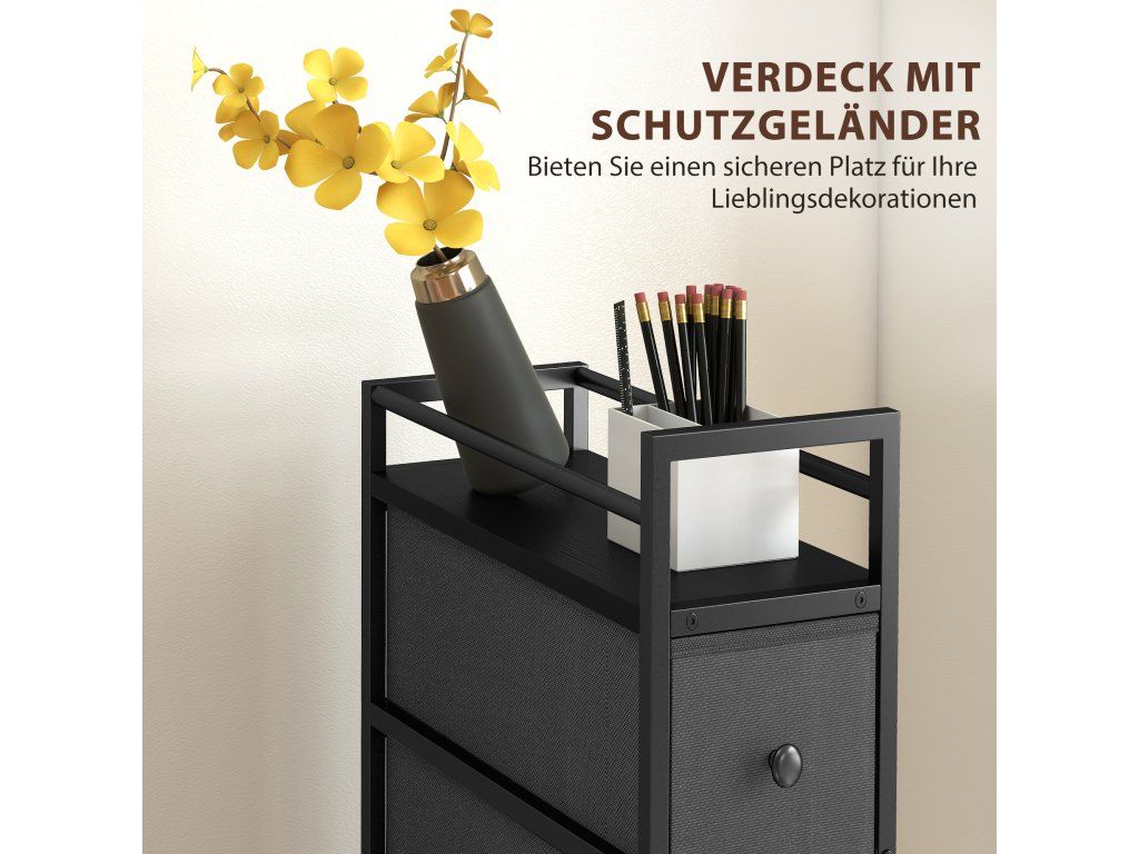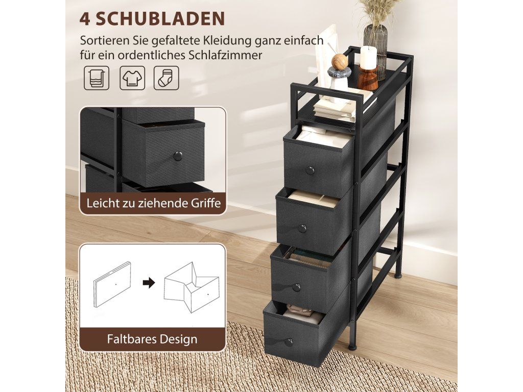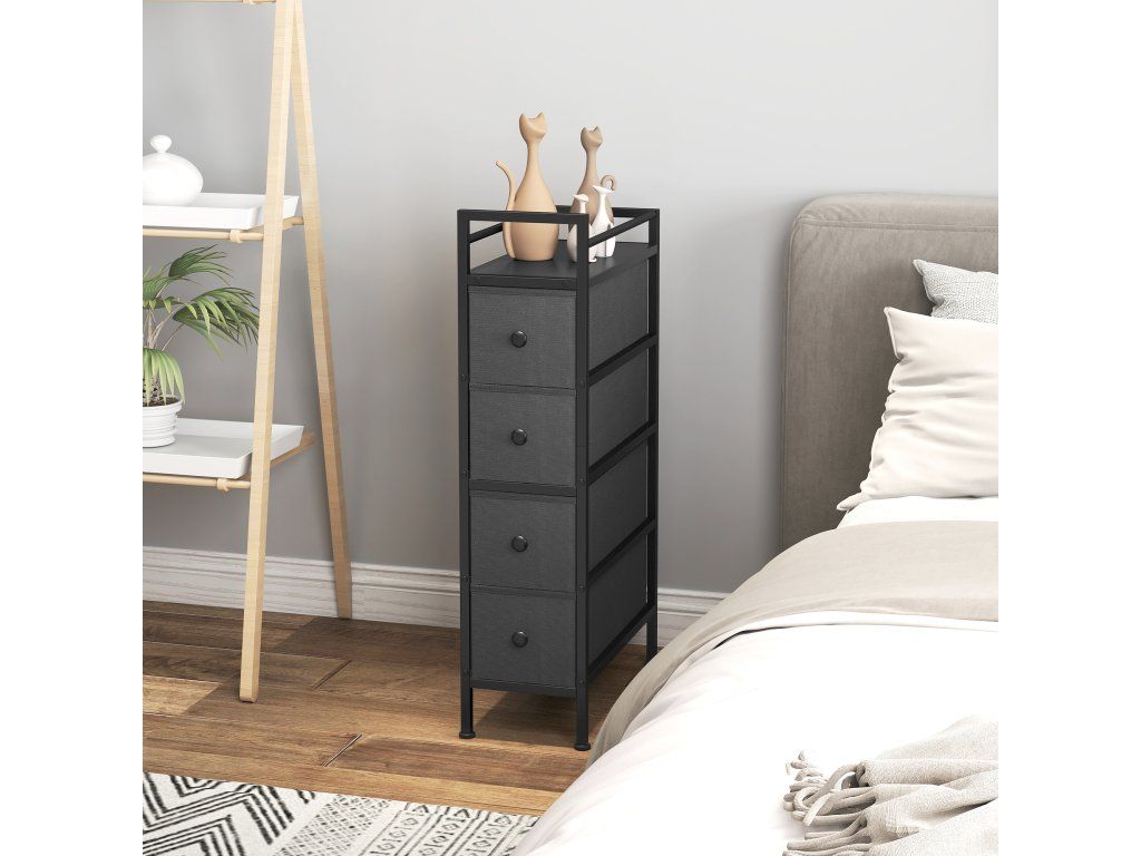 Trápí vás ta otravná úzká mezera vedle pohovky nebo postele? Tyto úzké prostory se často stávají zbytečnými hluchými zónami. Získejte je zpět s úzkou látkovou komodou. Čtyři hluboké zásuvky udrží všechny vaše nezbytnosti uspořádané, zatímco robustní rám bezpečně podepře vaše věci. A konečně, vneste klid a pořádek do nevyužitých koutů a proměňte je v atraktivní a funkční části vašeho domova s touto úzkou komodou.