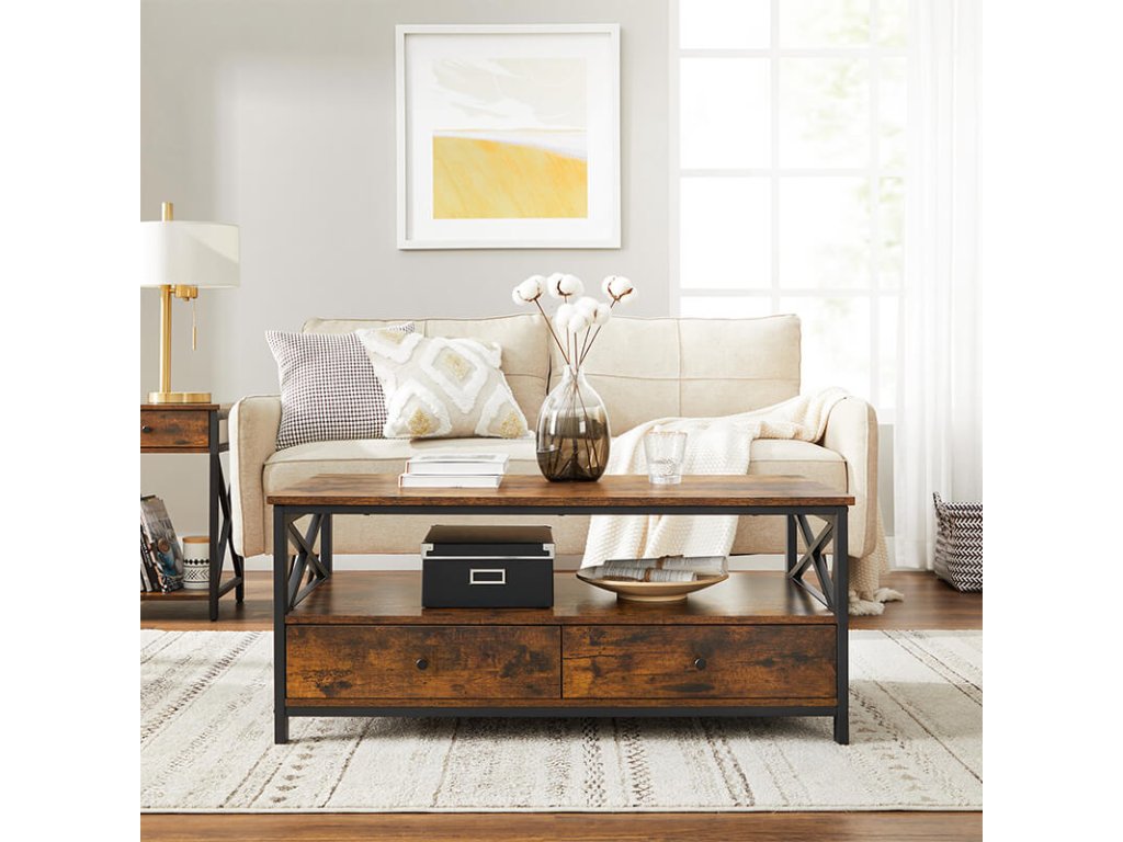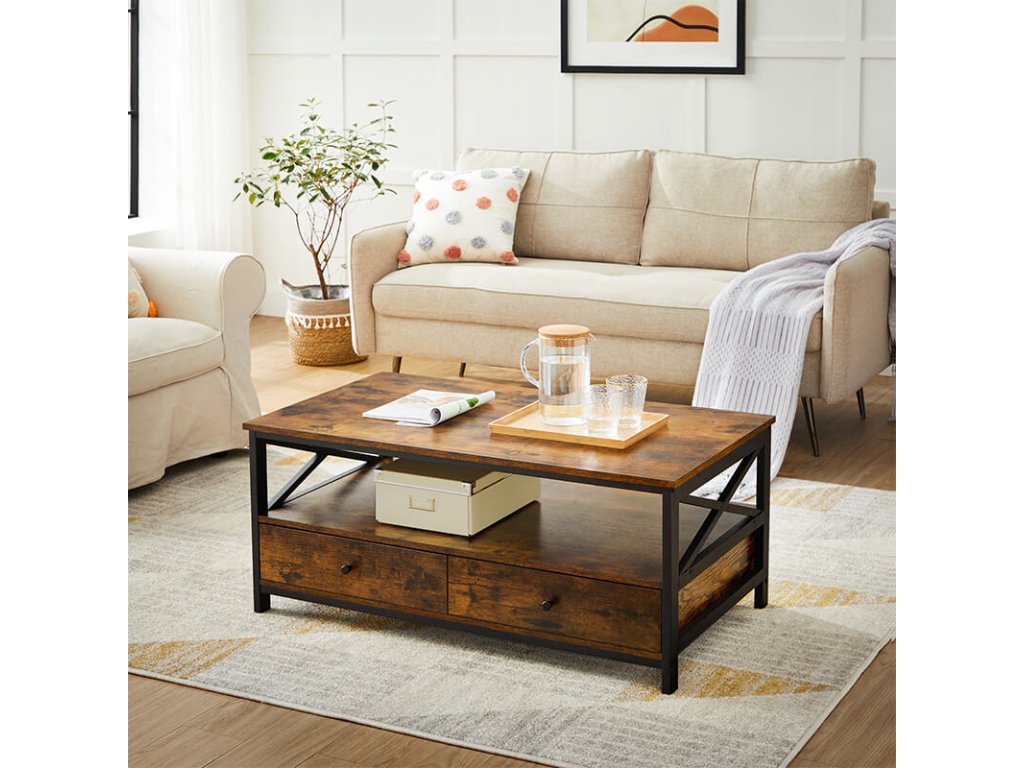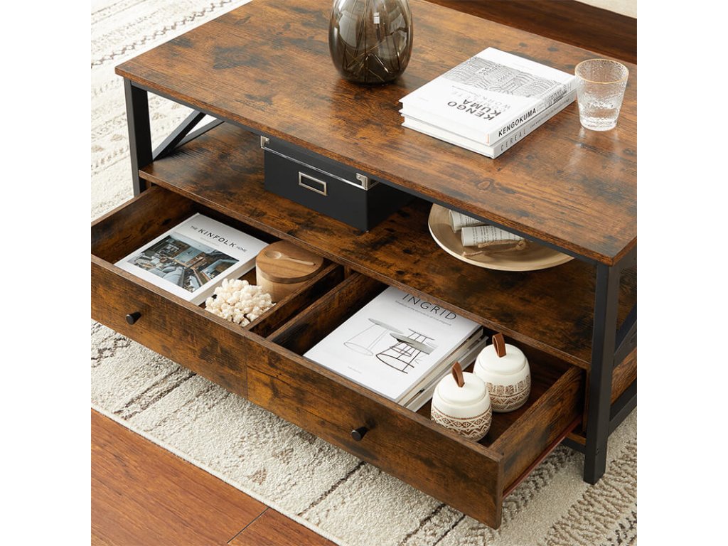 Tento konferenční stolek s rustikální deskou z hnědého umělého dřeva, policí a zásuvkami v kombinaci s matně černým kovovým rámem s příčkami vám poskytne dlouhotrvající pevnost a dlouholetou radost z používání.