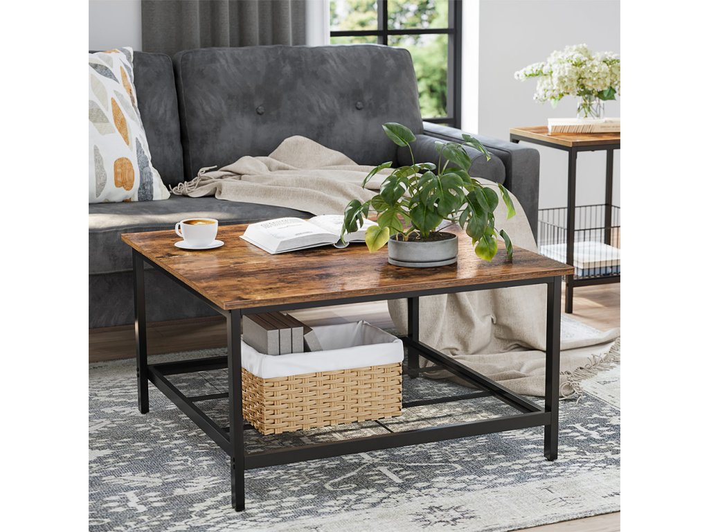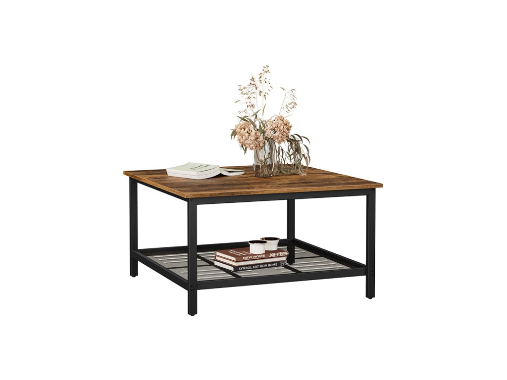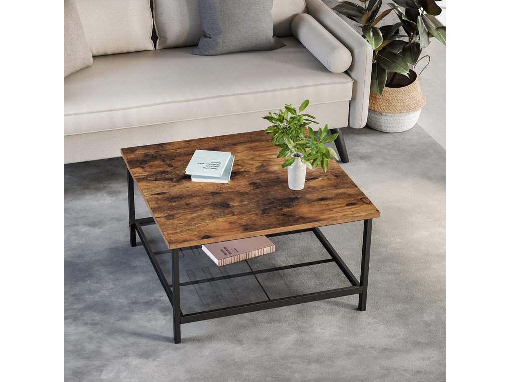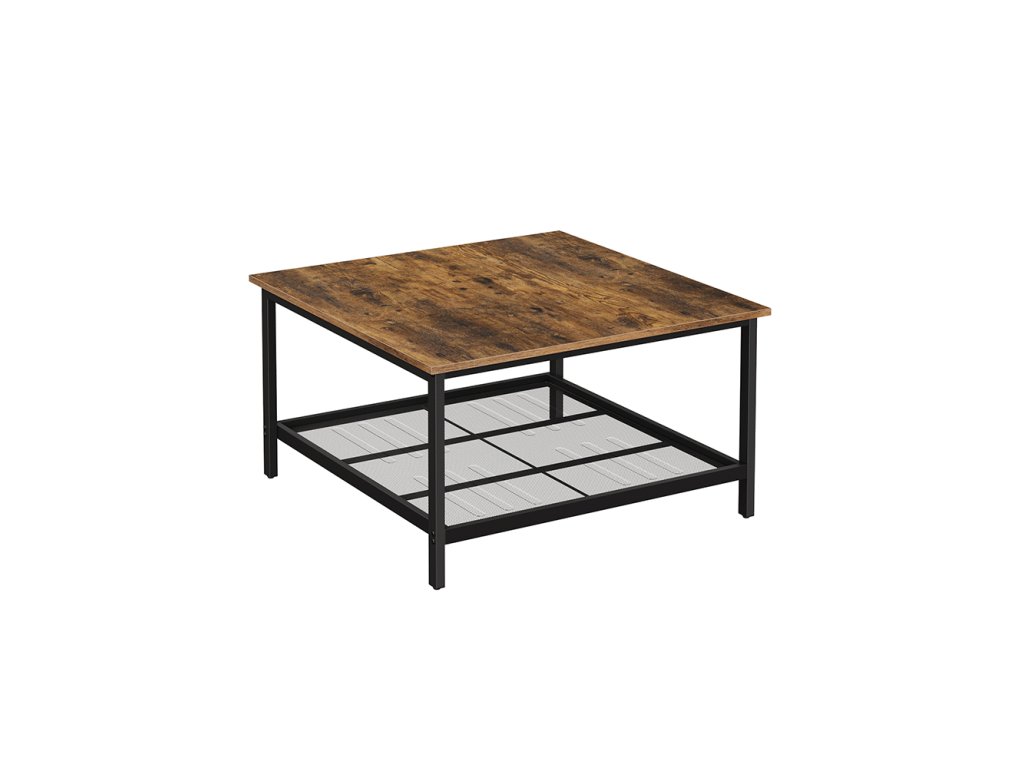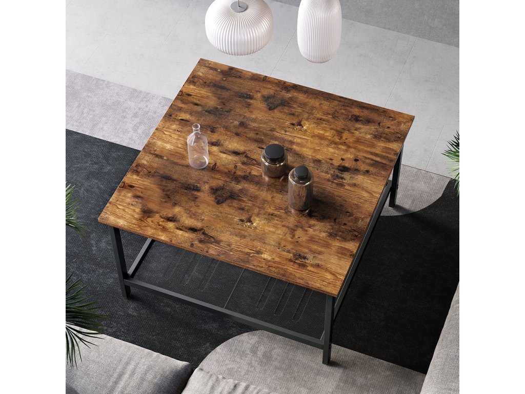 Konferenční stolek, čtvercový koktejlový stolek s prostornou deskou, robustním ocelovým rámem a síťovanou odkládací policí, industriální styl, do obývacího pokoje, rustikální hnědá a černá.