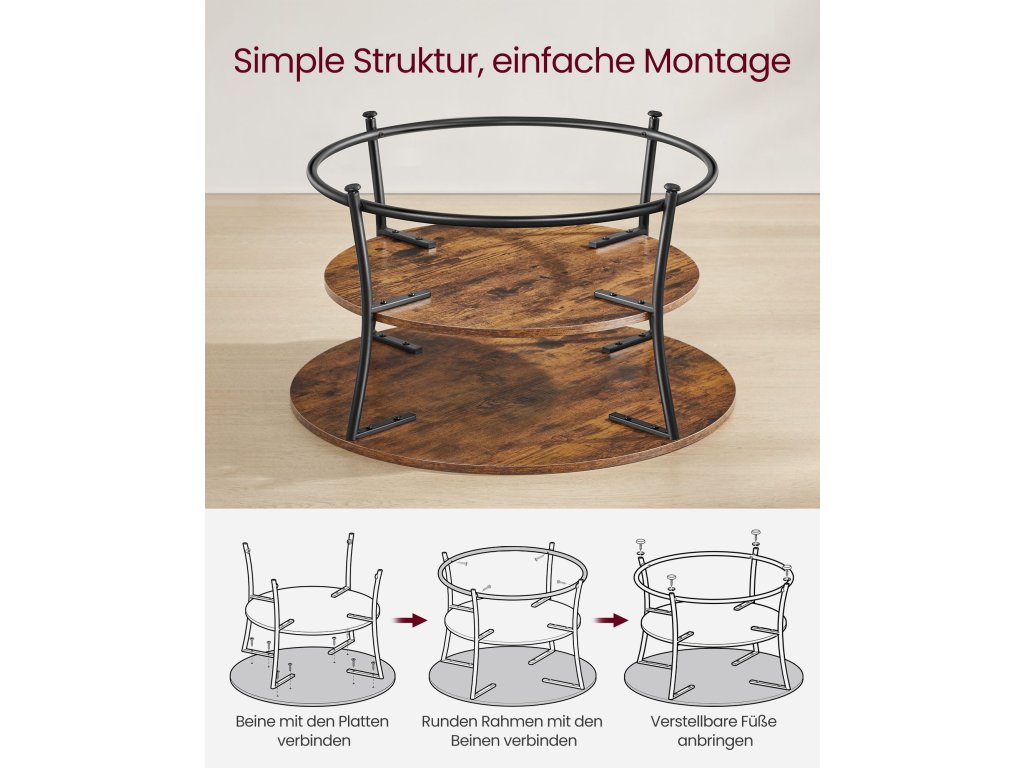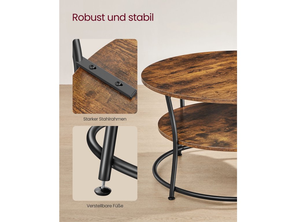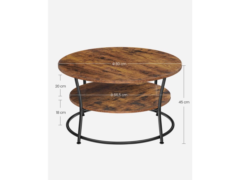 Vše se počítá: 2 kulaté, jemně opracované rustikální hnědé stolové plochy + černý železný rám + spousta úložného prostoru + jedinečný industriální designový vzhled - to vše se počítá. je to výjimečný konferenční stolek, který je třídou sám o sobě.Zaoblení prostoru: Tento obývací stůl je oslnivou hvězdou uprostřed vaší sedací soupravy. Doplníte jím už tak fantasticky vypadající nábytek v obývacím pokoji a strávíte nezapomenutelné večery s rodinou a přáteli.Rustikální, robustní, rafinované: Konferenční stolek má stabilní železné nohy, které jsou navíc vyztuženy kulatými trubkami. To znamená, že se stůl nepoddá, pokud na horní polici umístíte mnoho občerstvení a nápojů na večírek, ani když ho budete používat mnoho let.Krátké a křupavé: Tento koktejlový stolek lze naštěstí sestavit během chvilky díky jeho jednoduché konstrukci a zvládnutelnému počtu jednotlivých dílů. Ještě před příchodem hostů tak máte dost času na upečení dortu a uvaření kávy.Máte ještě otázky? V tom případě se obraťte na náš přátelský zákaznický servis a dopřejte svému obývacímu pokoji tento konferenční stolek z naší kolekce DAINTREE!