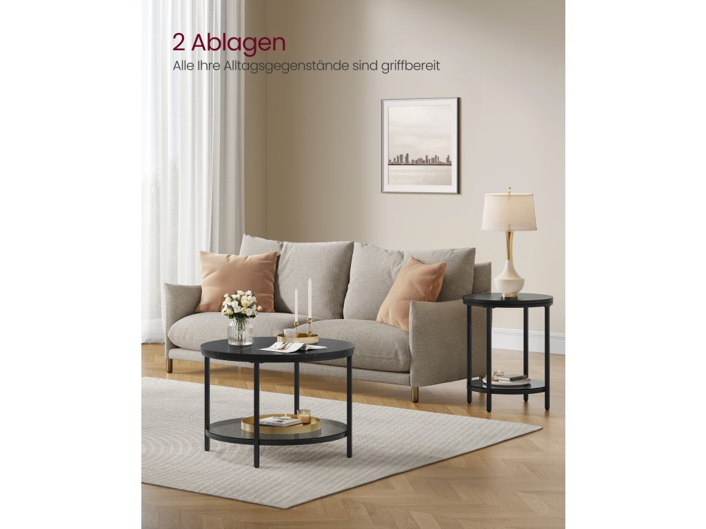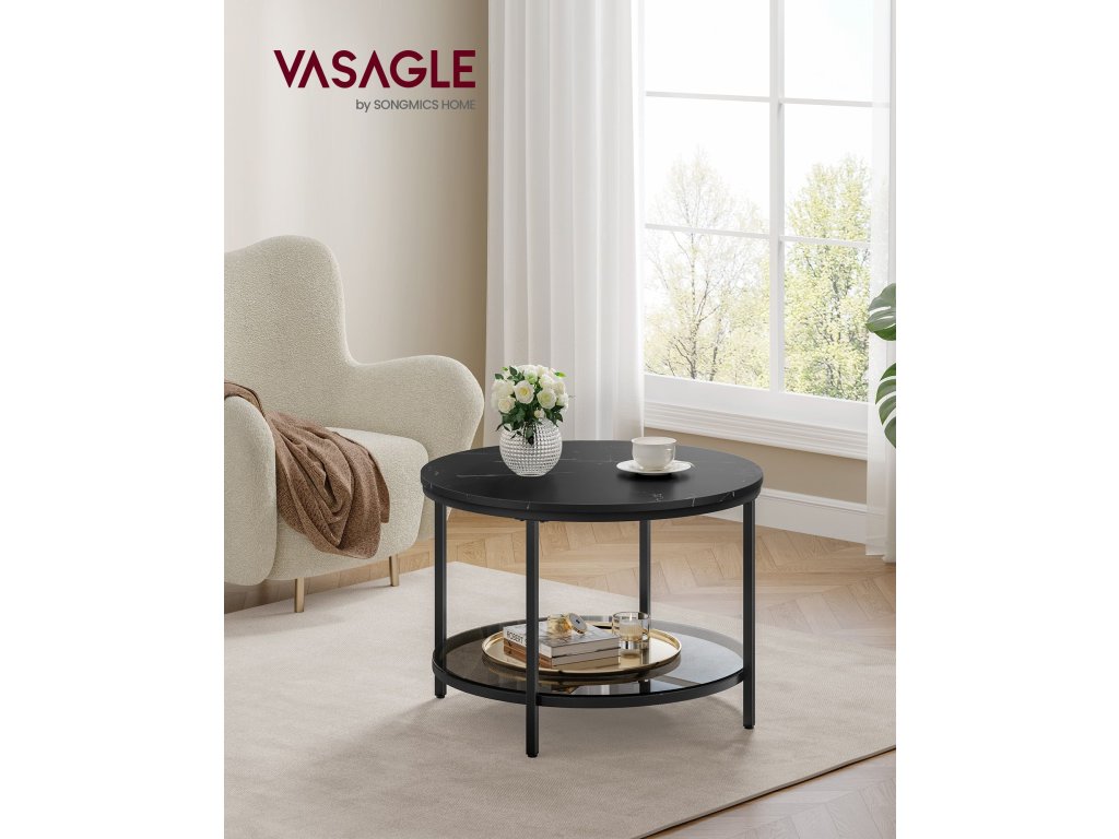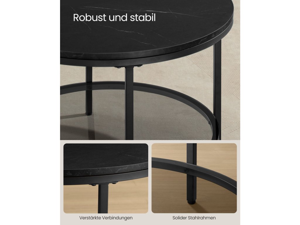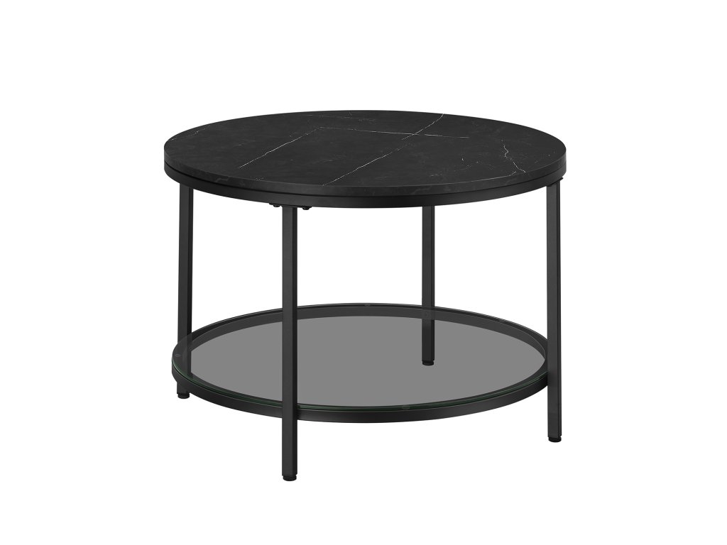 Konferenční stolek, stolek do obývacího pokoje, koktejlový stolek z umělého mramoru, kulatý, odkládací police z tvrzeného skla, snadno sestavitelný, moderní styl, do obývacího pokoje, mramorová černá a inkoustová černá.