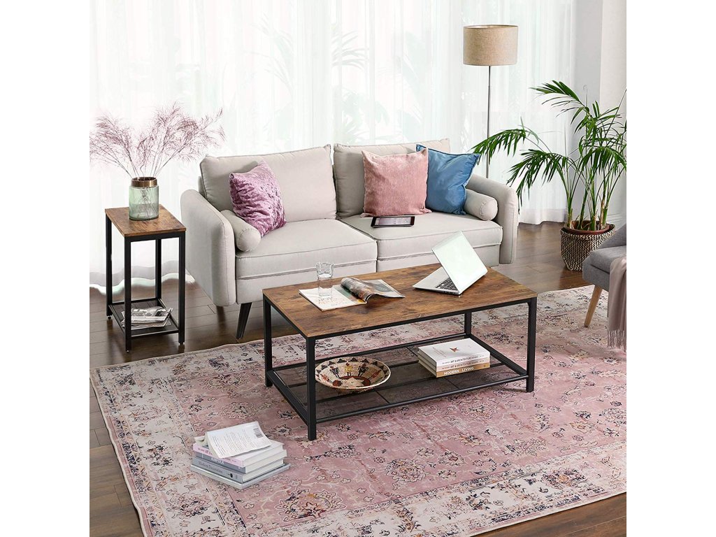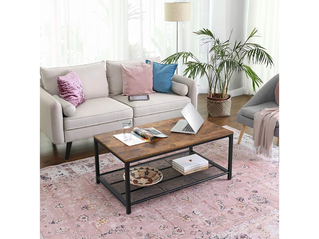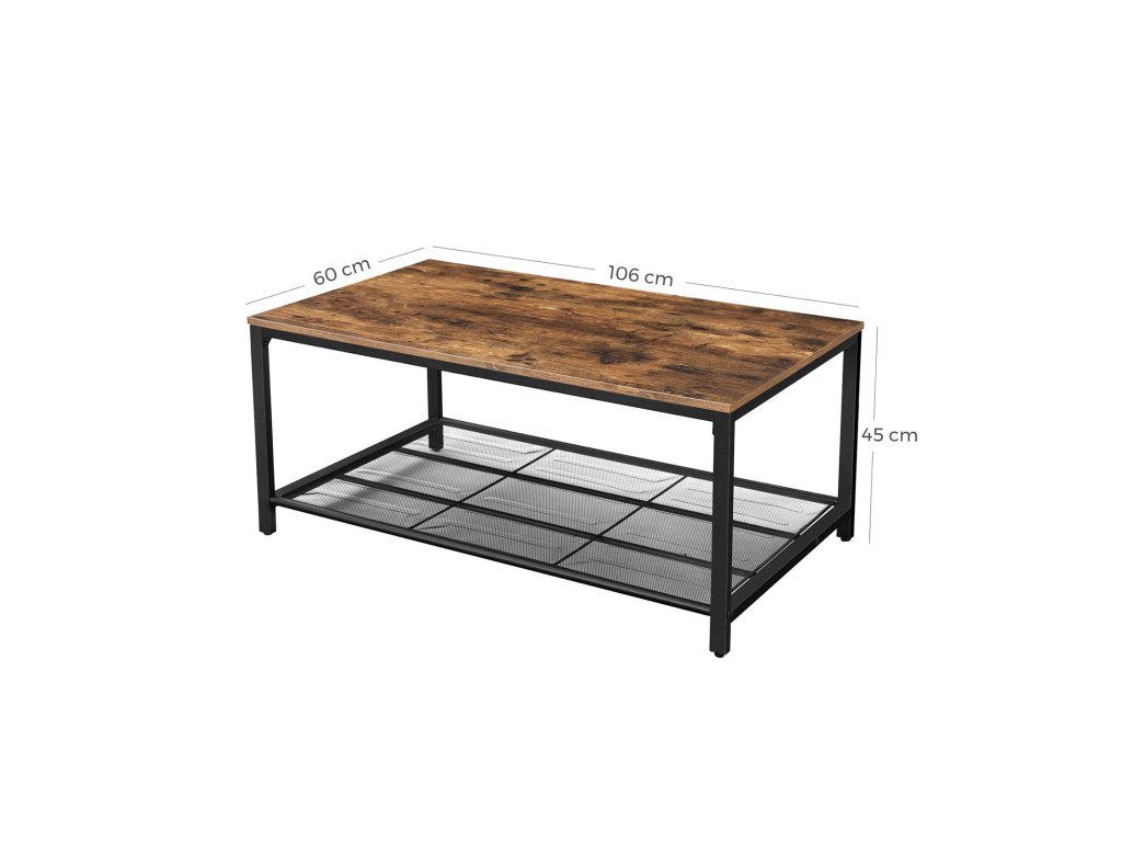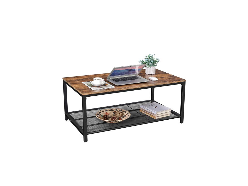 Konferenční stolek, stolek do obývacího pokoje s hustou síťovanou policí, velký úložný prostor, čajový stolek, snadná montáž, stabilní, průmyslový design, rustikální hnědá.