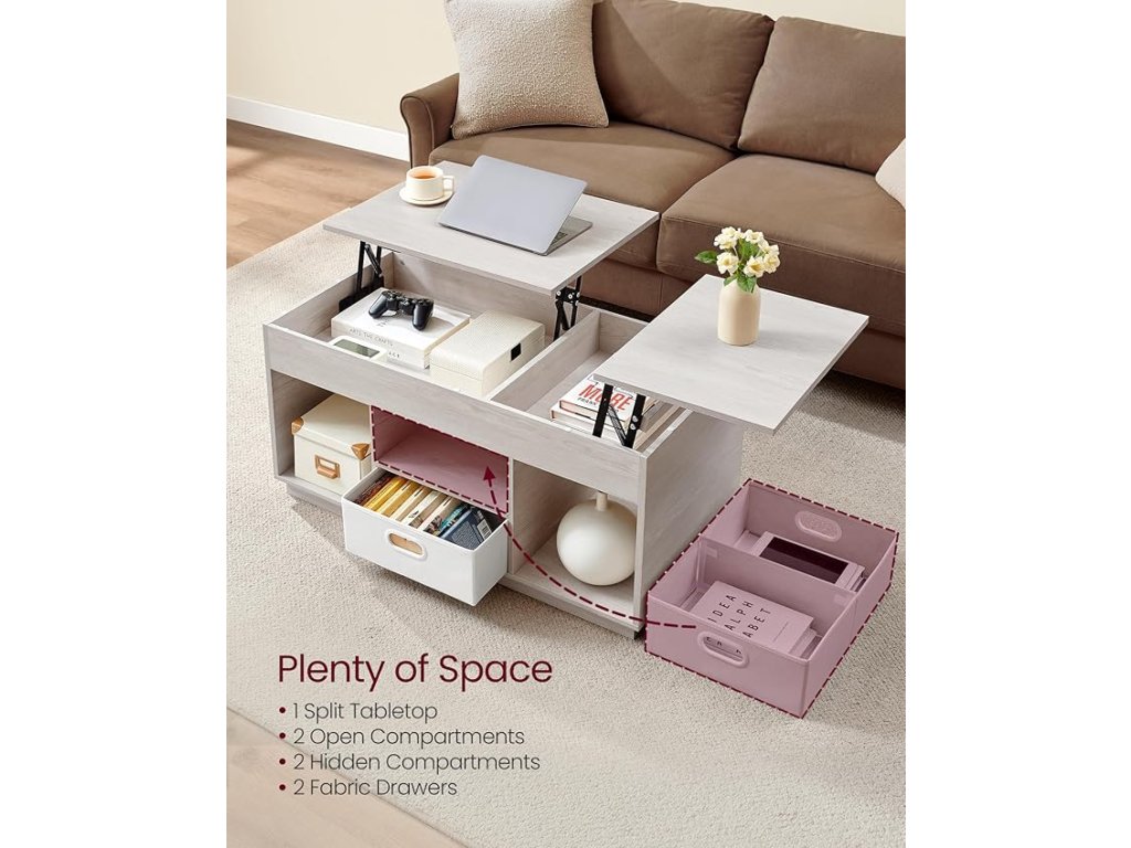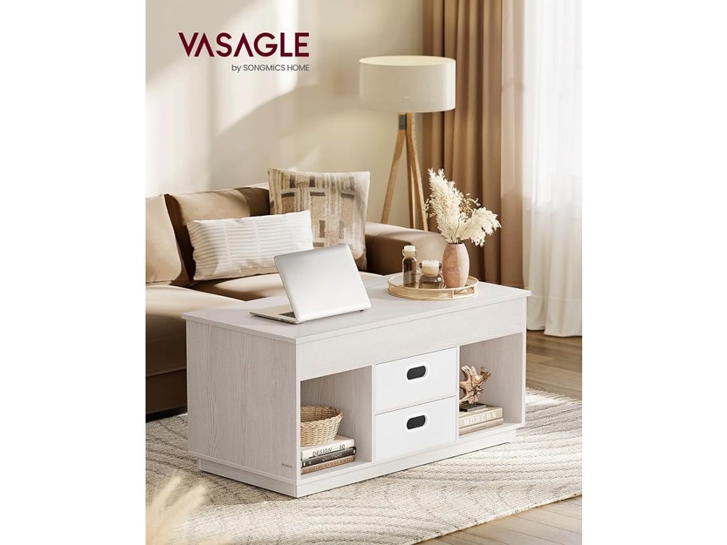 Konferenční stolek, zvedací konferenční stolek se 2 zásuvkami a skrytými přihrádkami, centrální stolek se zvedací deskou, otevřené přihrádky, do obývacího pokoje, domácí kanceláře, ovesná béžová.