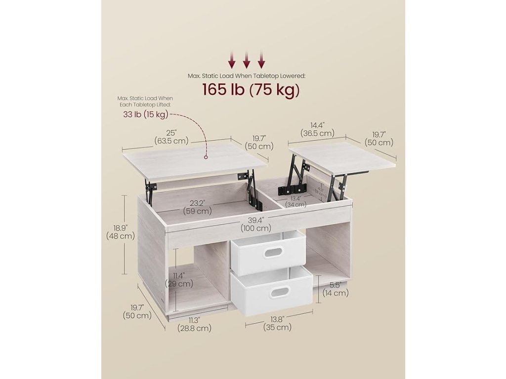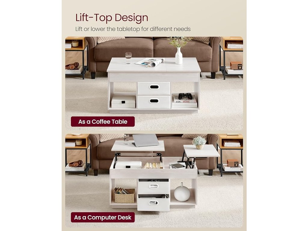 【FLEXIBILNÍ ZADNÍ DESKA】Náš konferenční stolek se zvedací deskou je vybaven dvousměrným zvedacím mechanismem, který umožňuje 2 nezávisle použitelné prostory. Větší část lze sestavit tak, aby se otevírala dopředu směrem k zásuvkám nebo se rozšířila dozadu a vyhovovala tak různým uspořádáním pohovky.