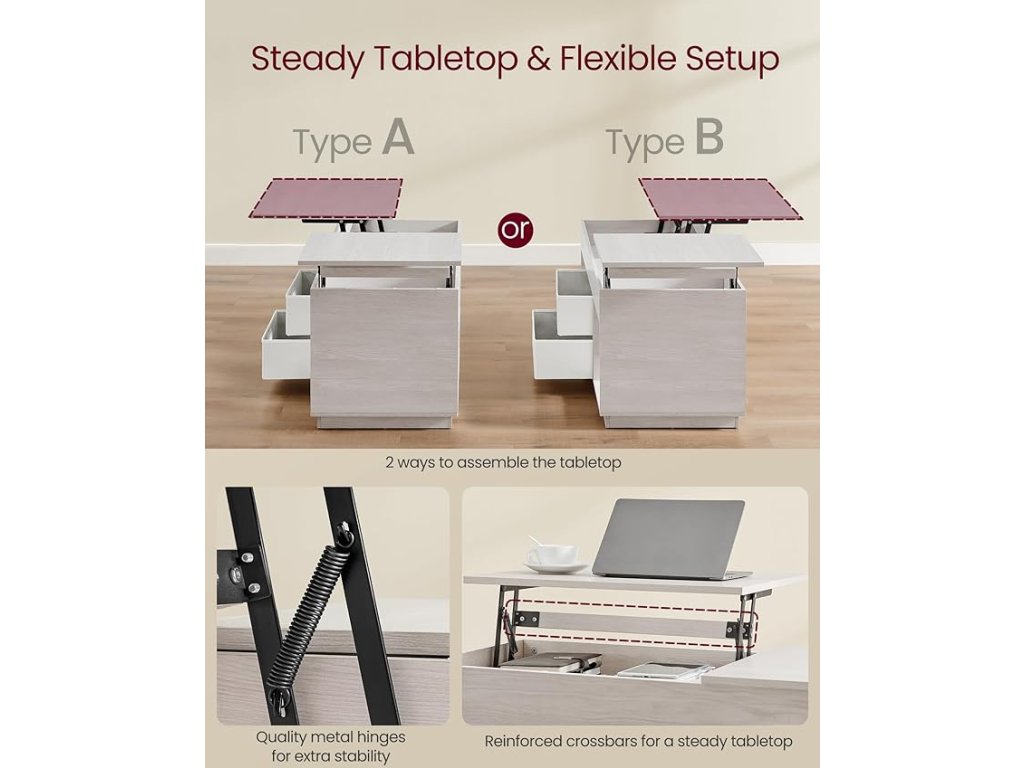 【STEADY. TICHÝ. BEZPEČNOST】 Prvotřídní kovové závěsy a zesílené příčky tohoto stolu do obývacího pokoje zajišťují stabilní a tiché zvedání a spouštění stolové desky, poskytují stabilní oporu a minimalizují riziko skřípnutí při spouštění.