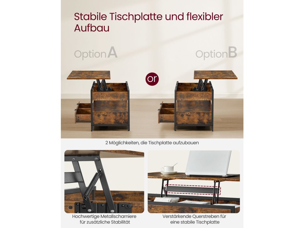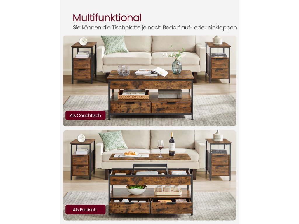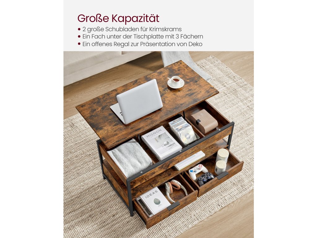 Konferenční stolek se zvedací deskou, obývací stůl, s úložnými zásuvkami, skrytými přihrádkami a otevřenou policí, rustikální hnědá a inkoustově černá.