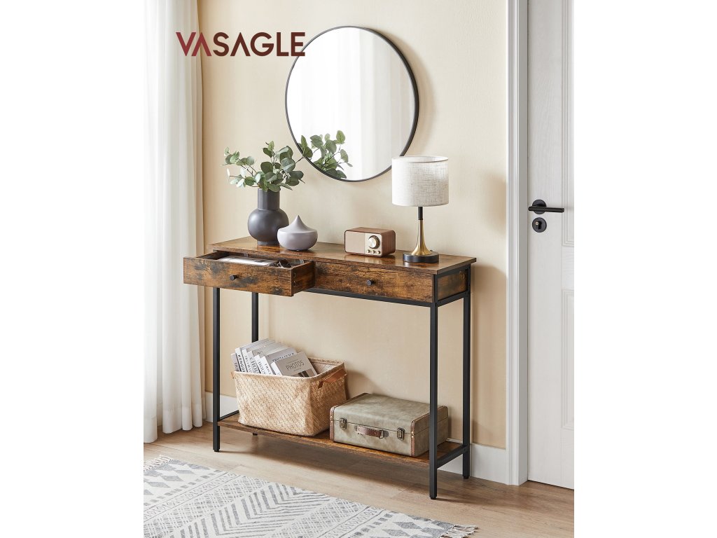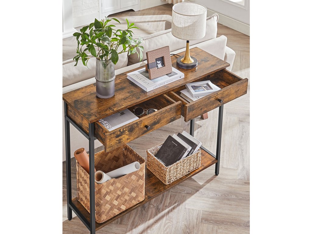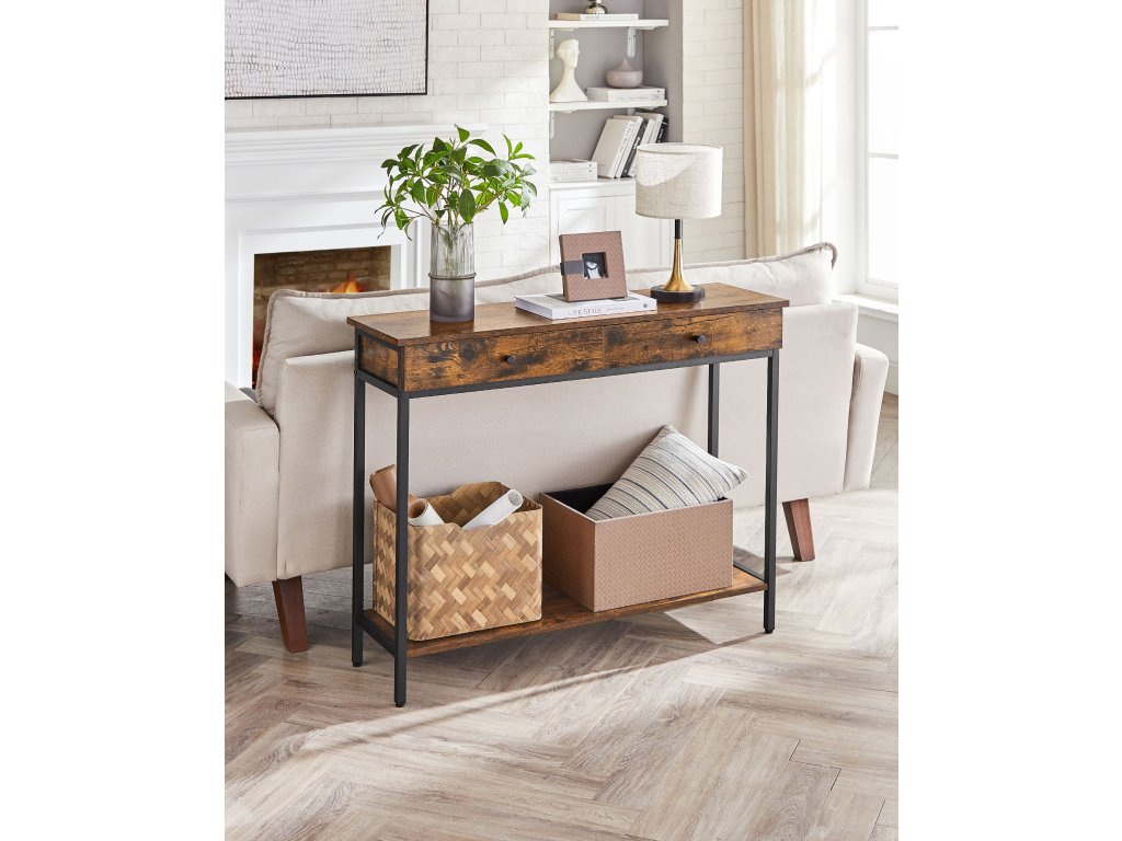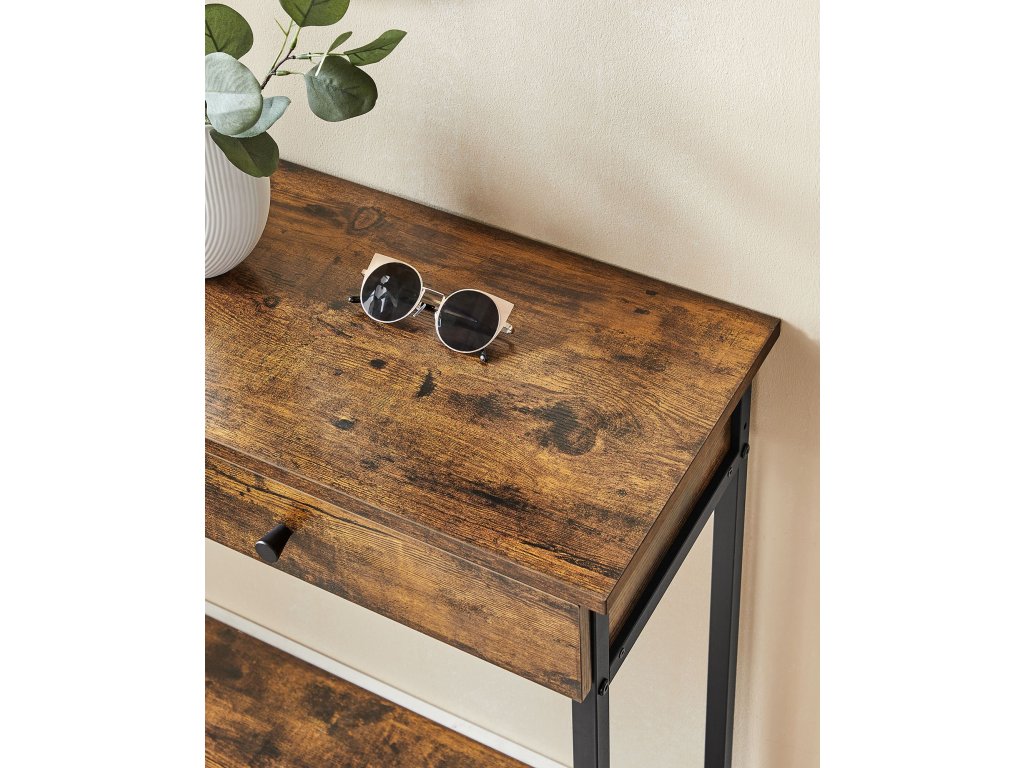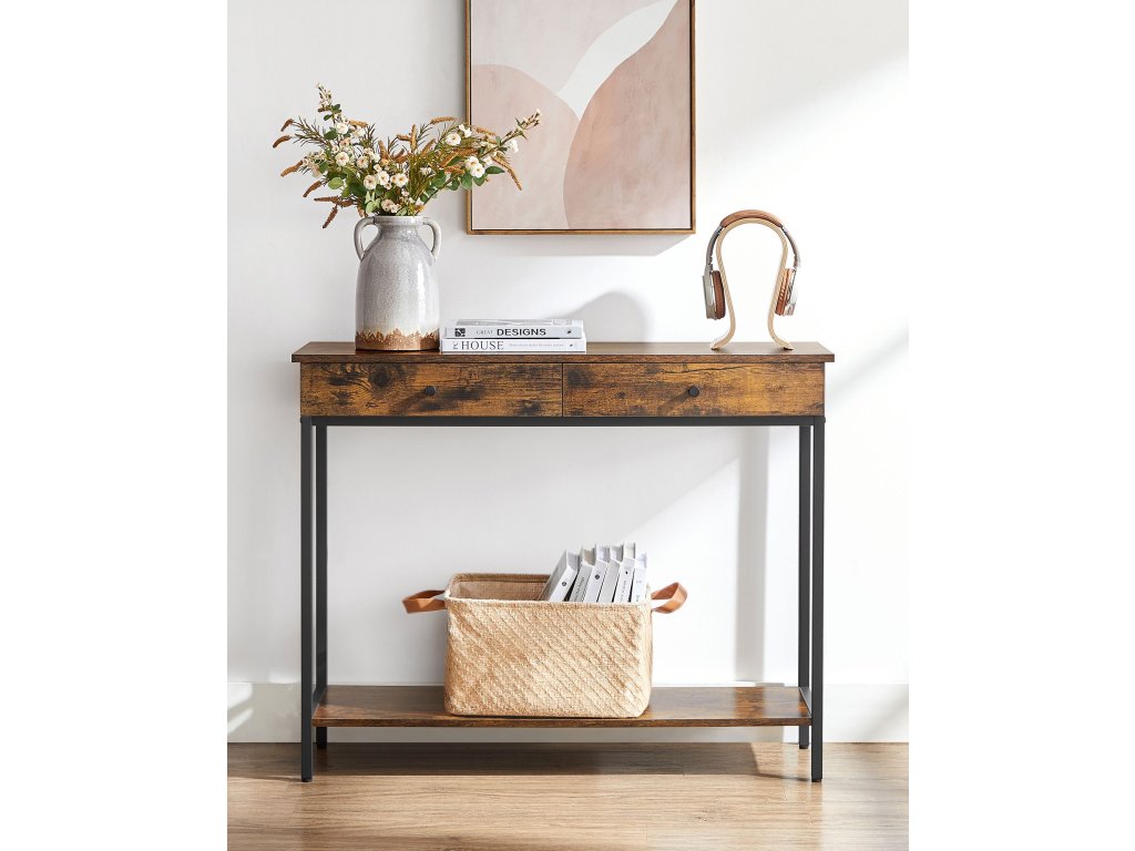 Konzolový stolek, předsíňový stolek, boční stolek, rozkládací stolek se 2 zásuvkami, ocelový rám, předsíň, obývací pokoj, průmyslový design, vintage hnědá/černá.