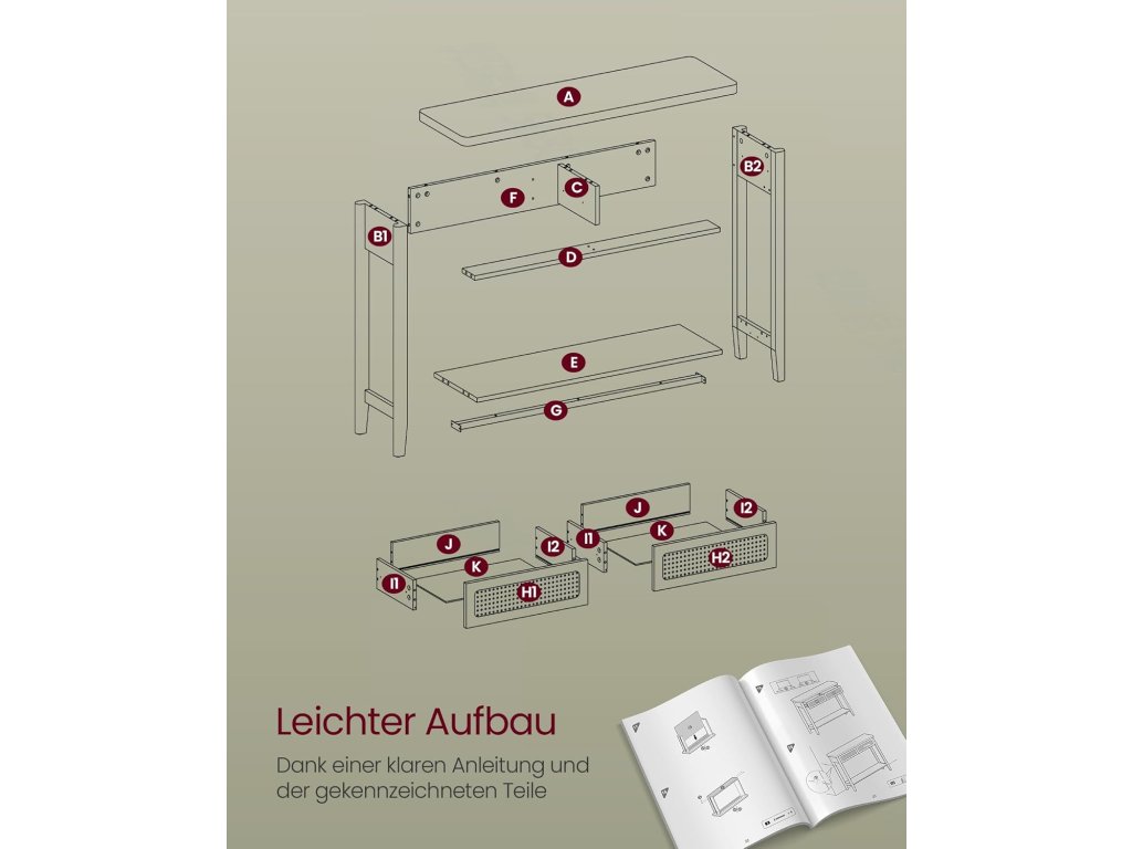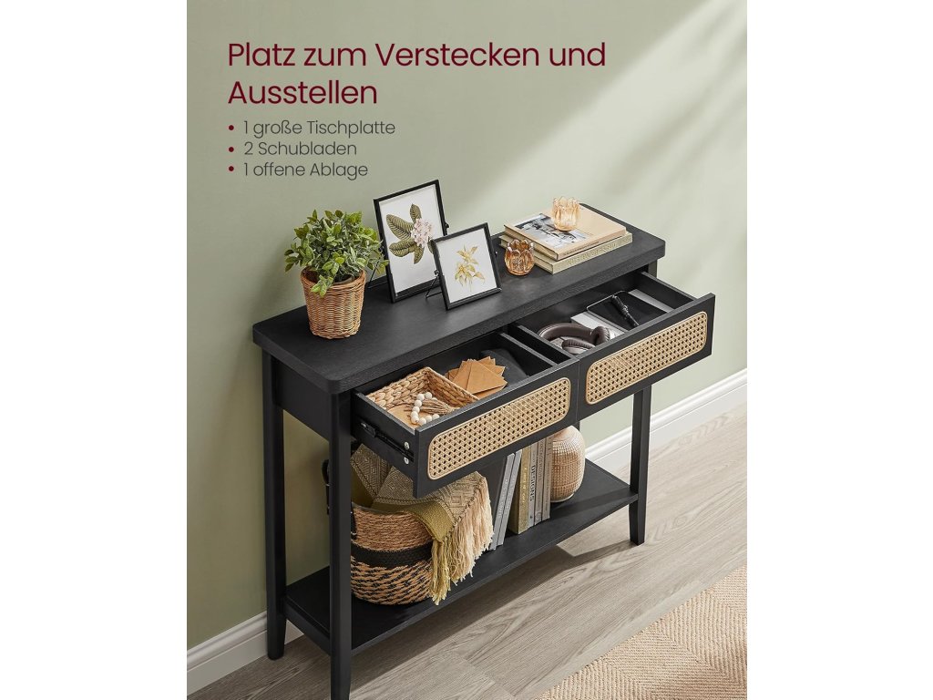 Nechte se unést boho šarmem Předsíňový stolek vykouzlí ve vašem domově nádech elegance. Její černý odstín je v souladu s přírodními prvky a přední strana zásuvky z PVC ratanu obohacuje rozmanitost textury. Modernější, více boho styl.Robustní a spolehlivé: Stůl je vyroben z vysoce kvalitní dřevotřísky, MDF desek a plastového ratanu a boduje robustní konstrukcí, která unese až 100 kg. Můžete do něj bezpečně uložit knihy, lampy, rostliny v květináčích nebo vonné svíčky.Spousta úložného prostoru Tento konzolový stolek nabízí velkou desku pro umístění často používaných předmětů nebo dekorací. 2 velké zásuvky pro uložení drobných předmětů mimo dohled a otevřená police pro uložení bot nebo košíků.BEZ NÁROČNÉ PÉČE A INSTALACE Hladký, dýhovaný povrch MDF je odolný proti vodě. Čištění je tak hračka - stačí otřít vlhkým hadříkem! Montáž je snadná díky jasnému návodu a označeným dílům.Všestranný univerzál Ať už tento stolek umístíte do ložnice, obývacího pokoje, vstupní haly, pracovny, jídelny nebo ke schodišti, dokonale se hodí a poskytne elegantní kulisu pro rámečky s obrázky. vázy nebo dekorace| Kategorie: | Konferenční stolky |