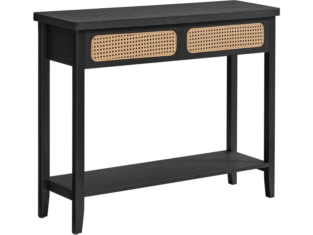 Konzolový stolek, předsíňový stolek, nábytek do předsíně, úzký rozkládací stolek do obývacího pokoje, 2 zásuvky, otevřená police, zaoblené rohy, styl Boho, jasan černý.