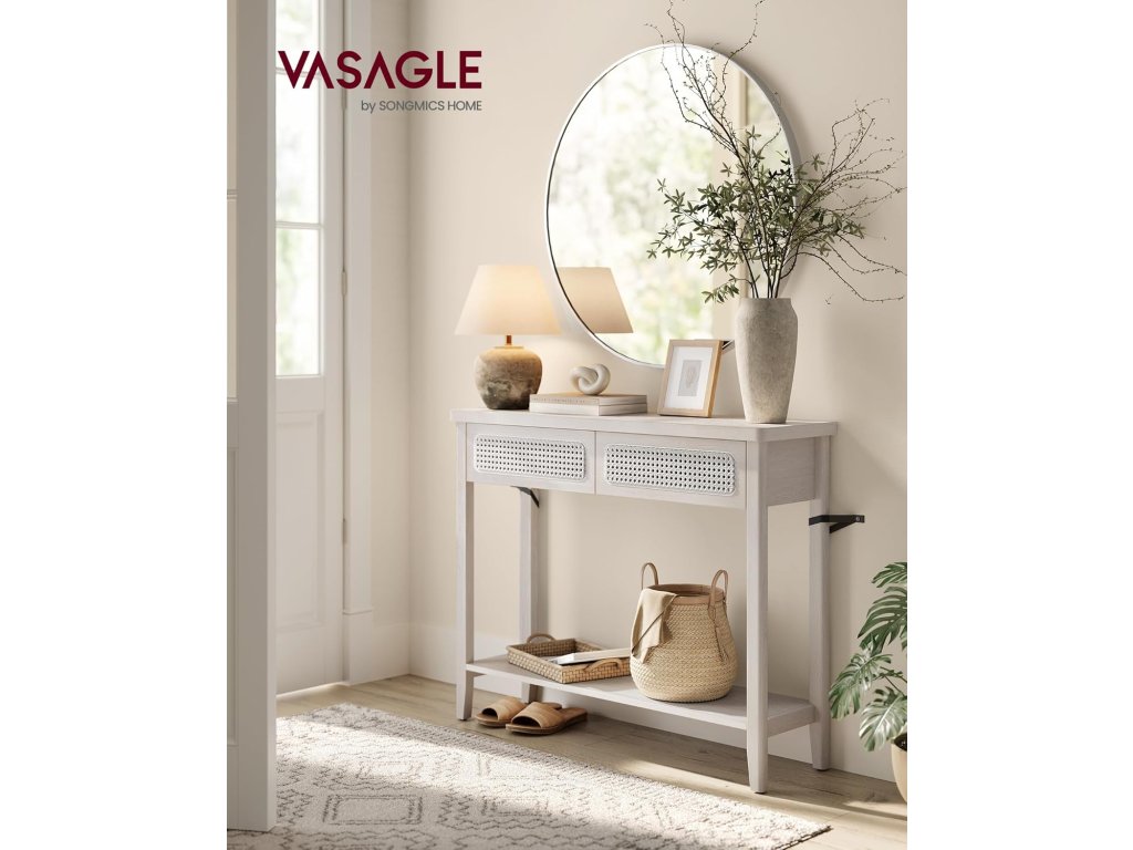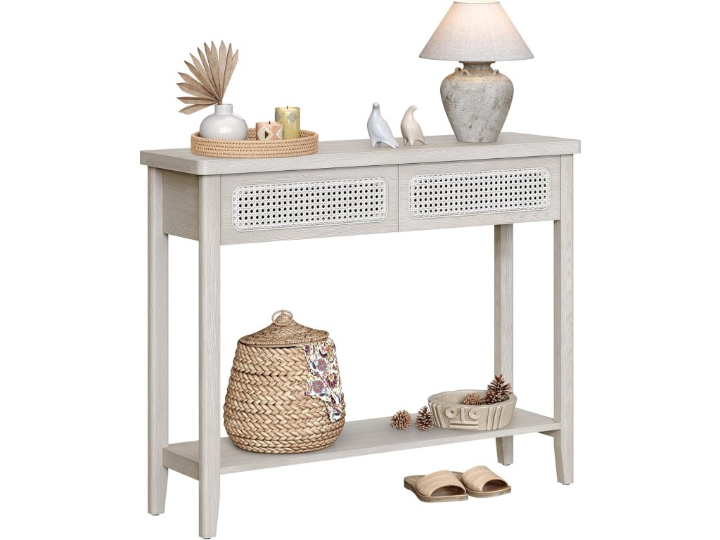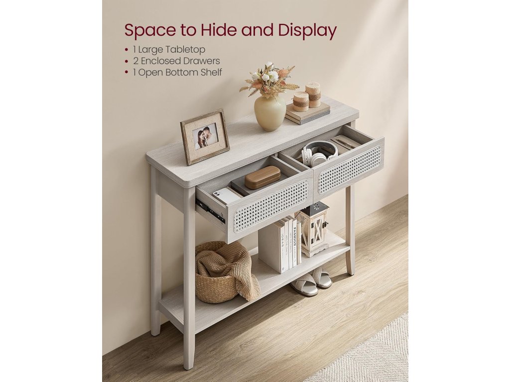 Konzolový stolek, rozkládací stolek, úzký předsíňový stolek, předsíňový stolek se 2 zásuvkami, otevřená odkládací polička, zaoblené rohy, do obývacího pokoje, styl Boho, béžová barva.